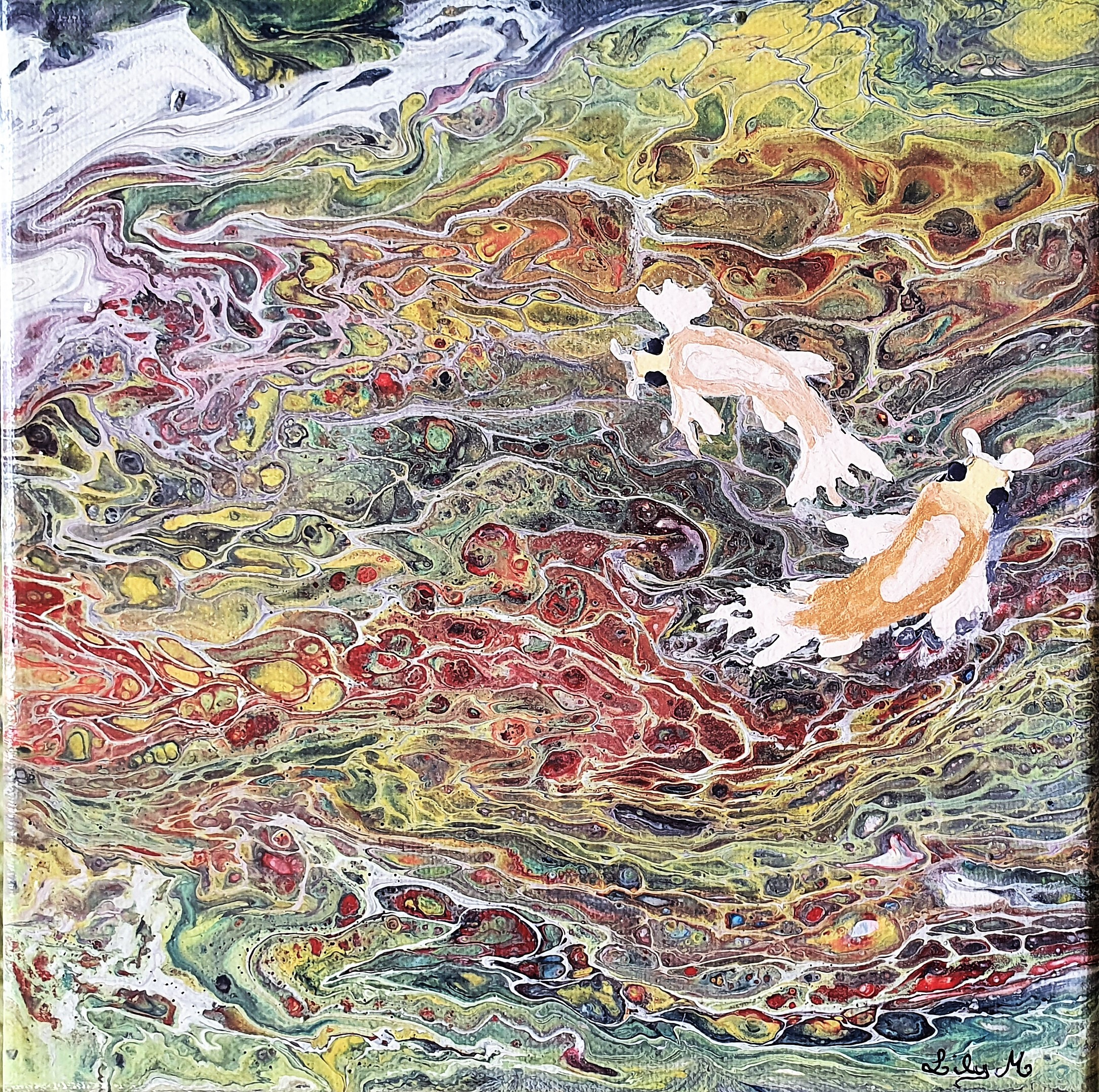 Réalisée selon la technique fascinante du pouring (coulage acrylique), ce tableau est une explosion de couleurs qui se mêlent pour former un motif abstrait et organique.