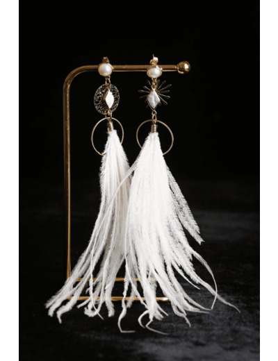 Paire de boucles d'oreilles faite d'acier inoxydable, perle de synthèse, perle d'eau douce et plume autruche blanche