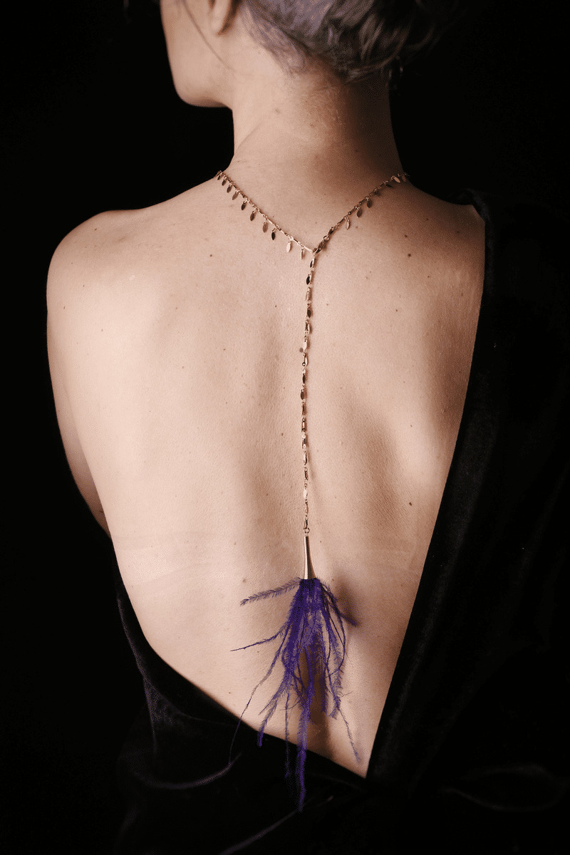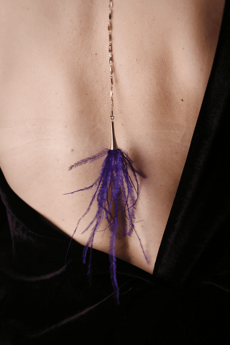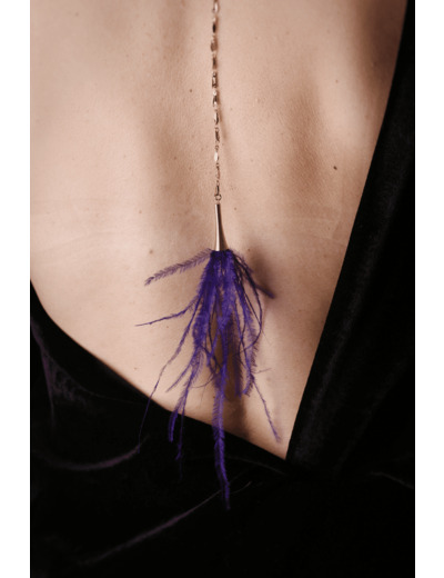 Il est composé d'éléments couleurs or, de pampilles, et d'une plume d'autruche violette