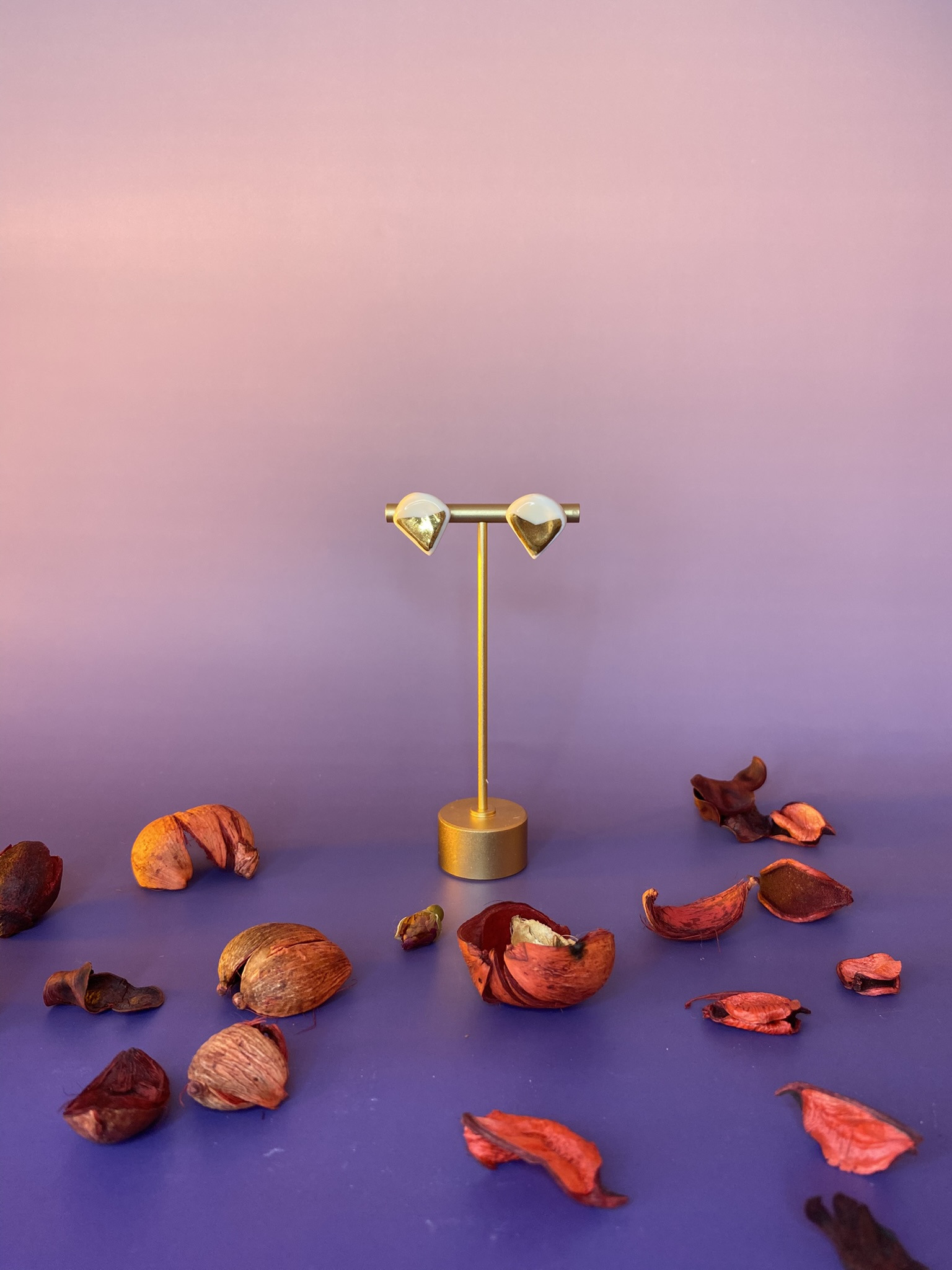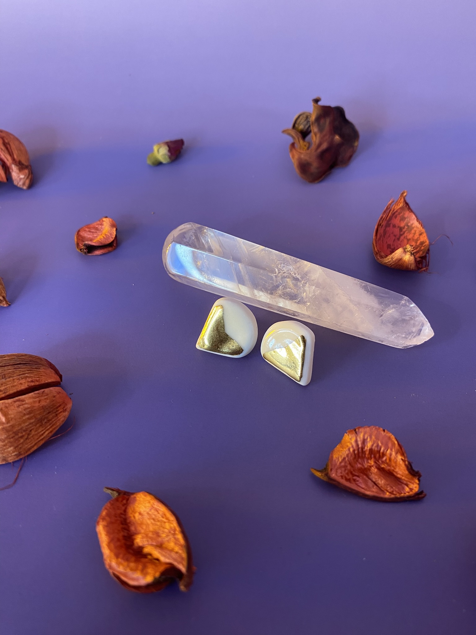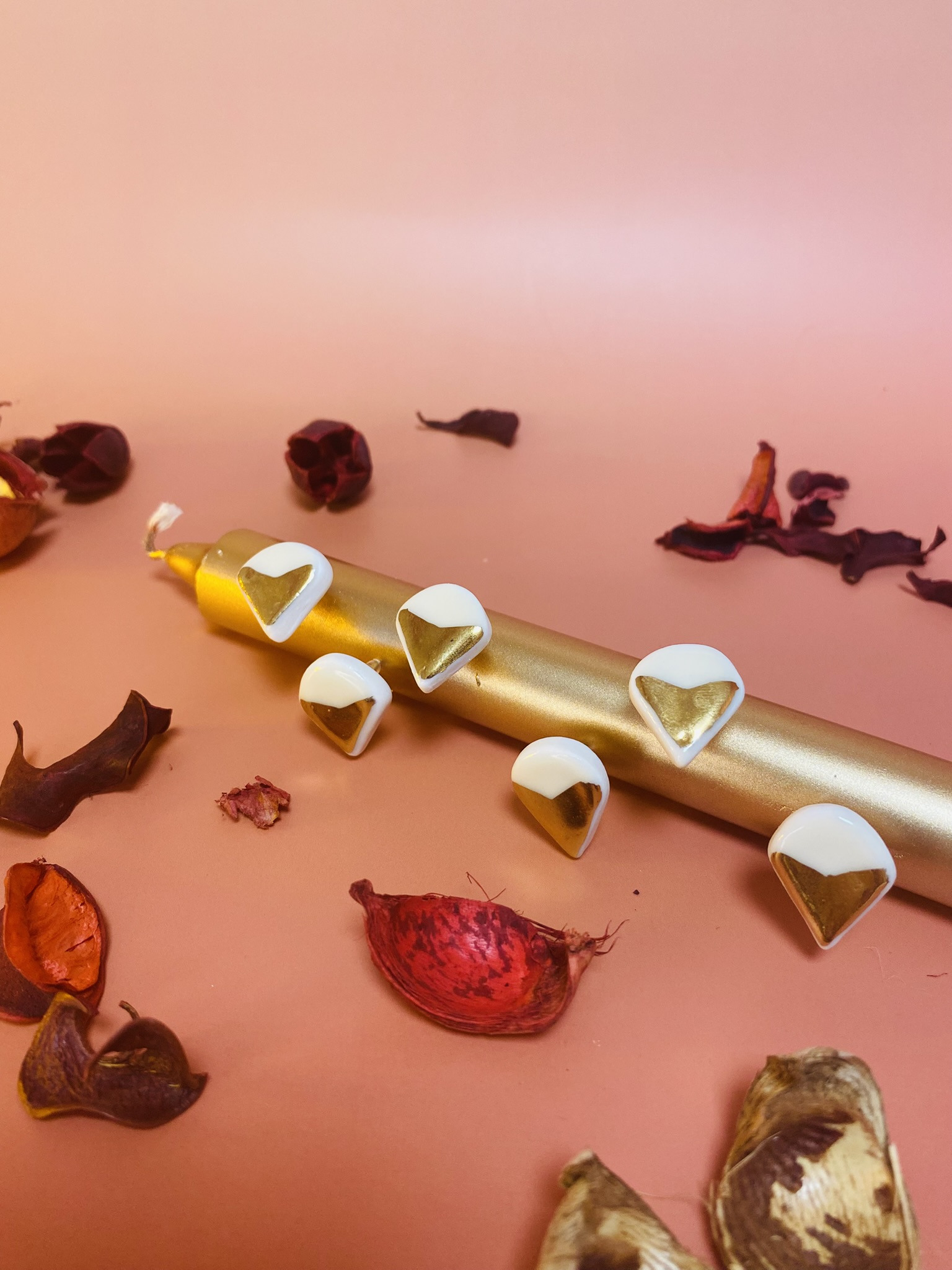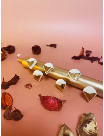 Chaque pièce est modelée une à une avec soin dans une porcelaine extra-blanche dans mon atelier à Tours, puis est cuite une première fois à 1000°C. Un émail doux et brillant est appliqué sur chaque bijou, avant la deuxième cuisson, à 1280°C. Les boucles sont ensuites délicatement dorées à l'or fin, avant leur dernière cuisson.