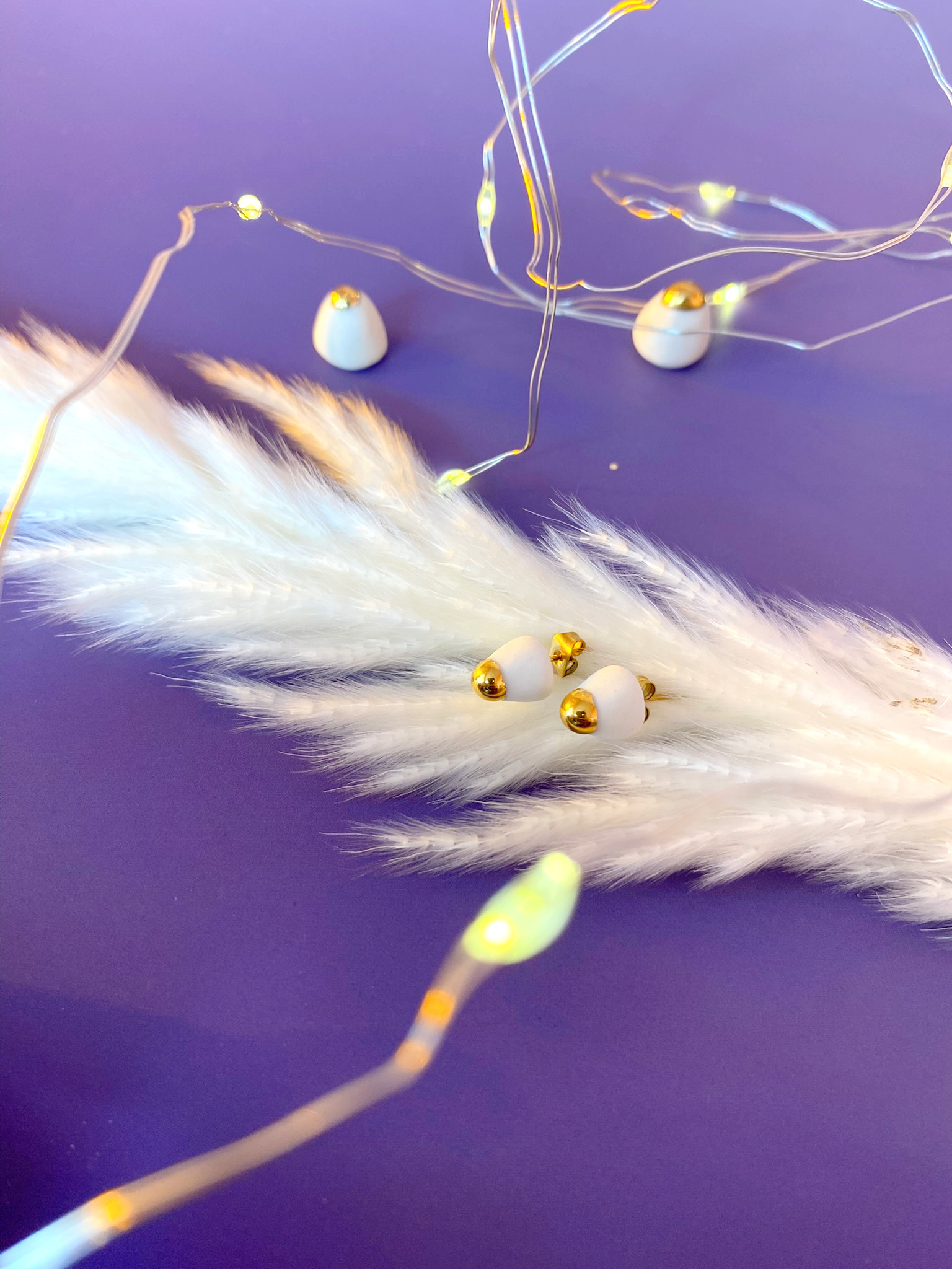 Ces boucles d’oreilles en porcelaine prennent la forme de petites pointes arrondies, comme des fragments de lumière façonnés à la main. Leur silhouette fine semble avoir été doucement polie par le souffle du feu, jusqu’à trouver cet équilibre subtil entre douceur et caractère.