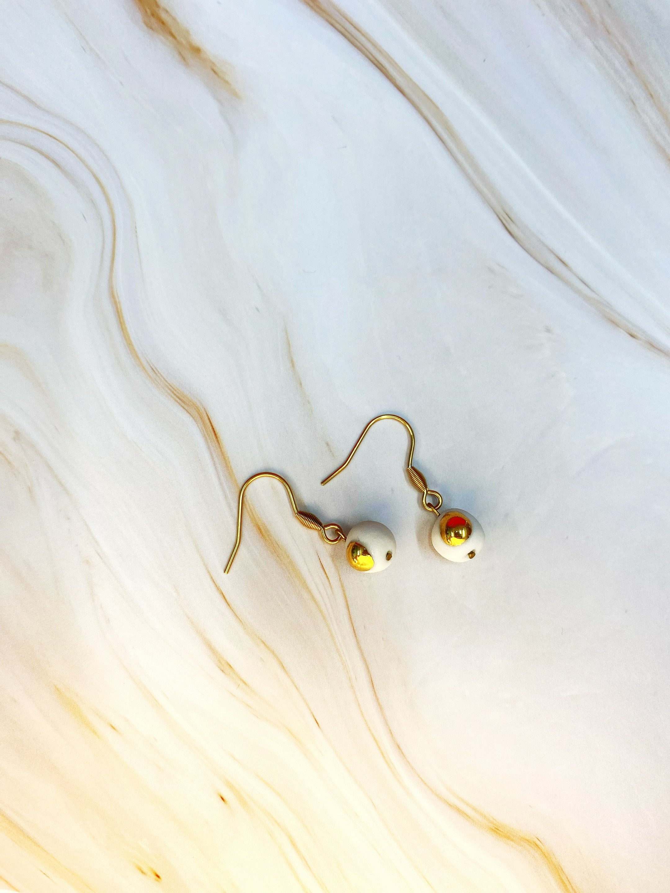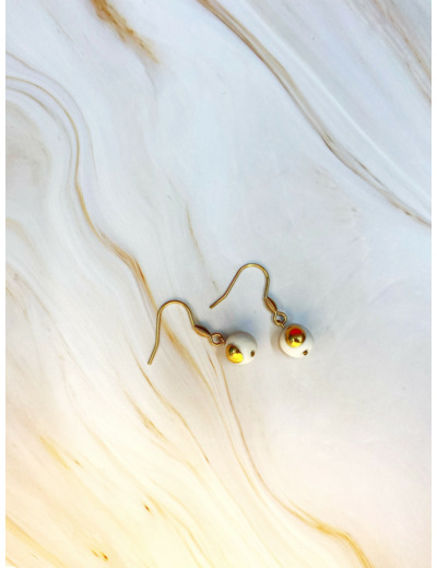 Tout en simplicité, ces boucles d'oreilles en porcelaine prennent la forme d’une petite boule lumineuse, comme un grain de lumière cueilli au petit matin. Leur galbe rond et épuré évoque la pureté des formes essentielles et, comme un flocon, rappelle la beauté discrète de la nature hivernale.