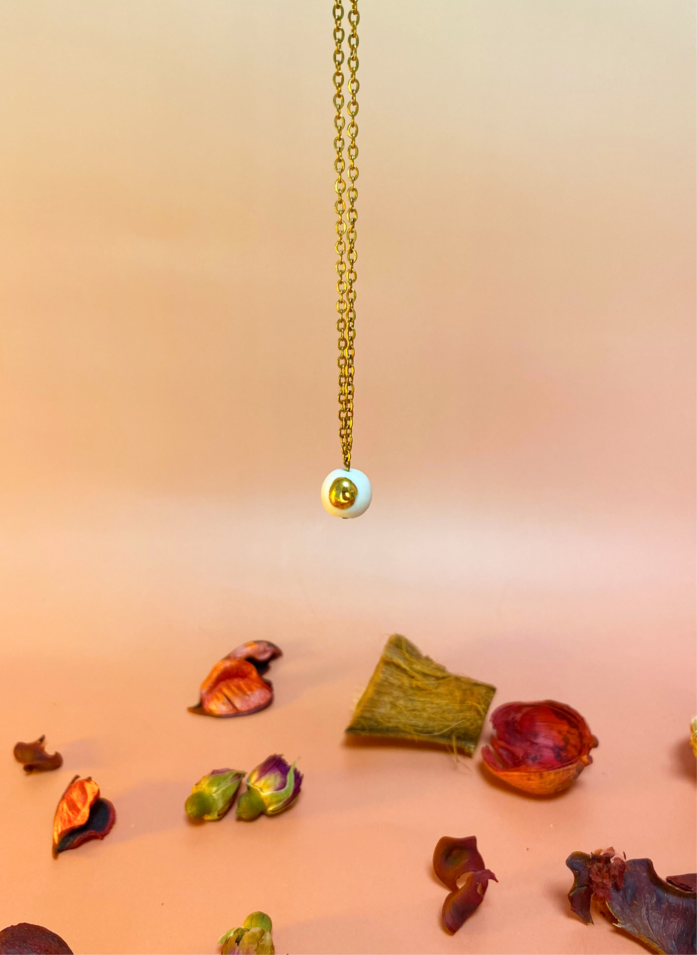 Tout en simplicité, ce pendentif en porcelaine prend la forme d’une petite boule lumineuse, comme un grain de lumière cueilli au petit matin. Son galbe rond et épuré évoque la pureté des formes essentielles et, comme un flocon, rappelle la beauté discrète de la nature hivernale.