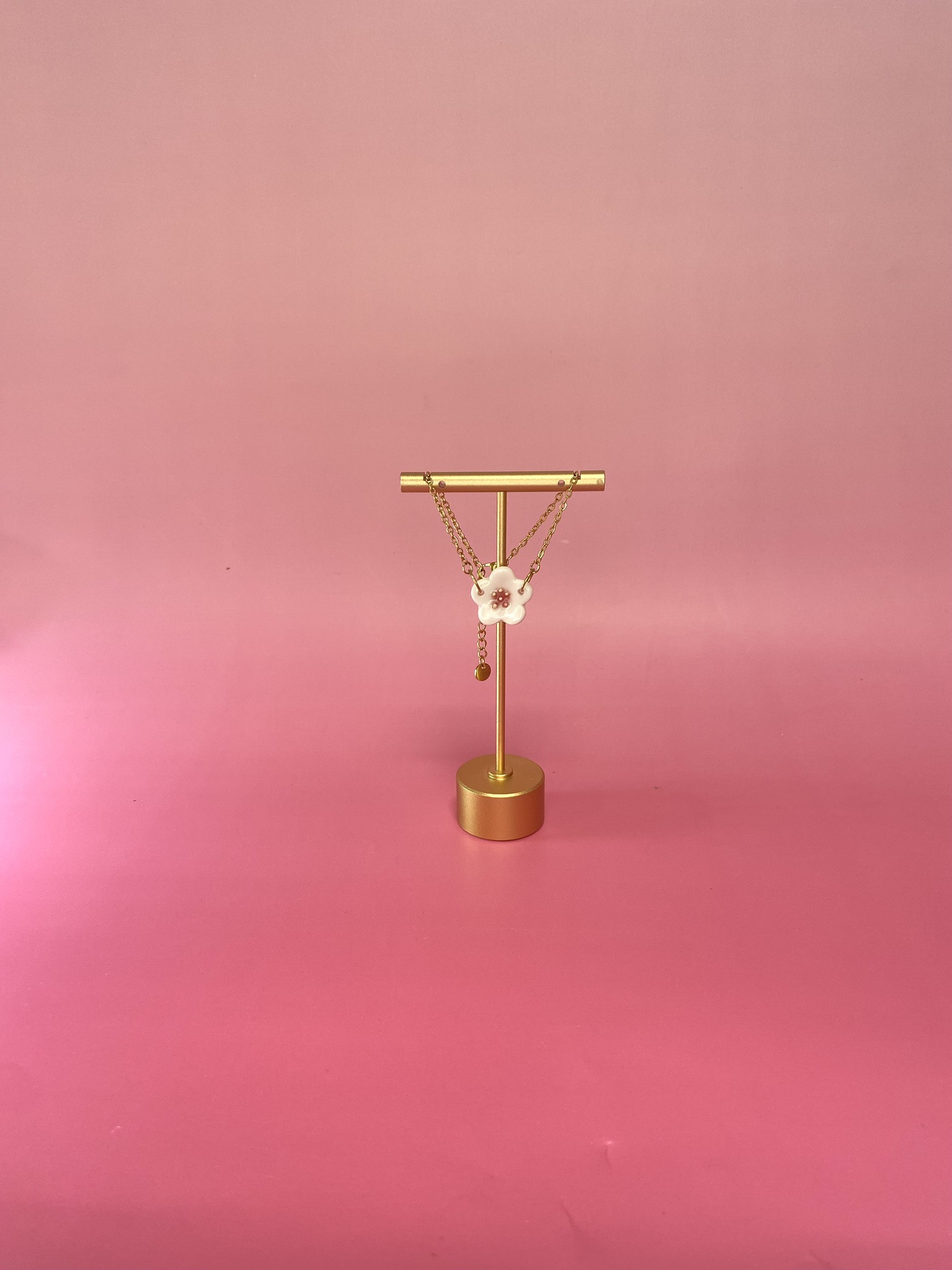 Le pendentif est réalisé en porcelaine délicate cuite une première fois à 1000°C, avant d'être peint en rose et jaune puis émaillé. Enfin, il est cuit une seconde fois, à 1280°C, ce qui lui confère toute sa solidité et sa préciosité.