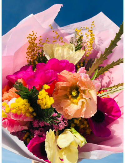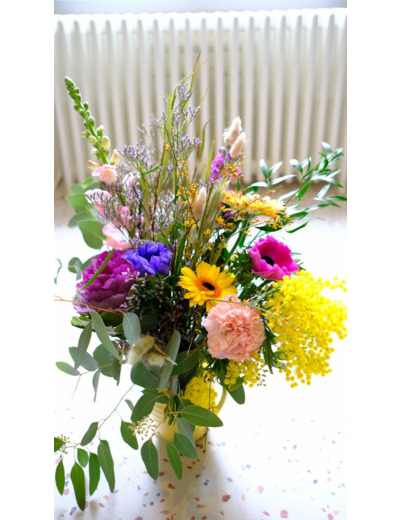 Pourquoi un bouquet surprise : Pour vous surprendre et vous étonner chaque semaine! Il est composé de fleurs joyeuses et colorées! Parfois multicolore, parfois dans un camaïeu, parfois pastel, il change chaque semaine au gré des envies et des saisons. Mais il est toujours composé de fleurs françaises, dénichées le plus localement possible par Clémence*.