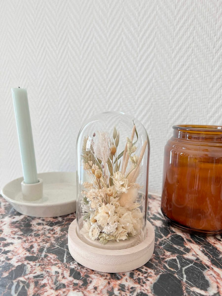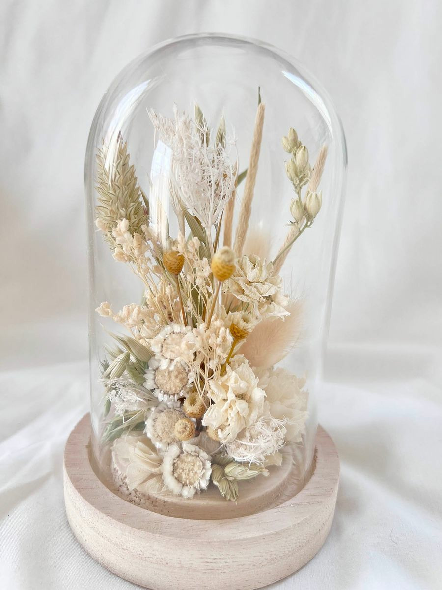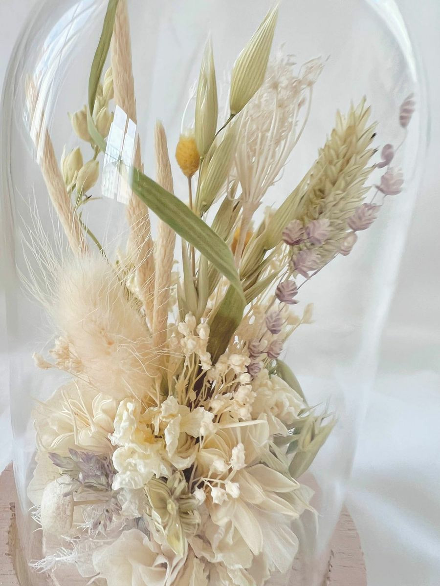 Cloche fleurie composée de fleurs séchées et stabilisées.
