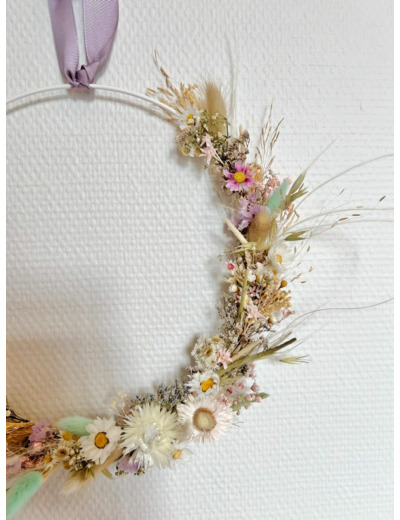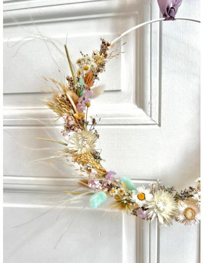Couronne décorative composée de fleurs séchées et stabilisées.