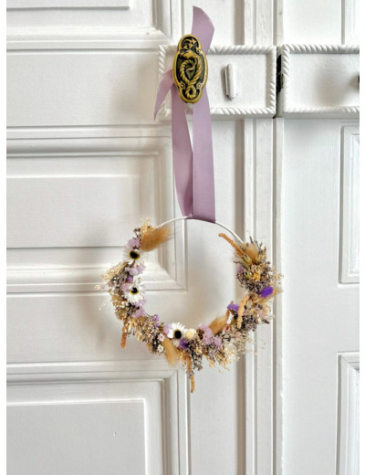 Couronne décorative composée de fleurs séchées et stabilisées.