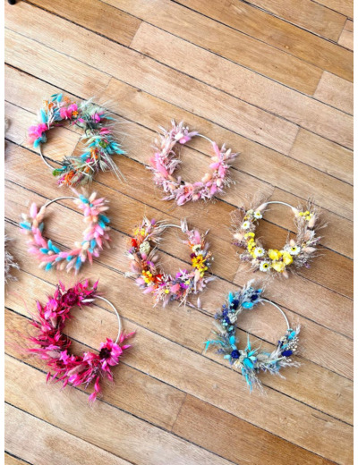 Couronne décorative composée de fleurs séchées et stabilisées.