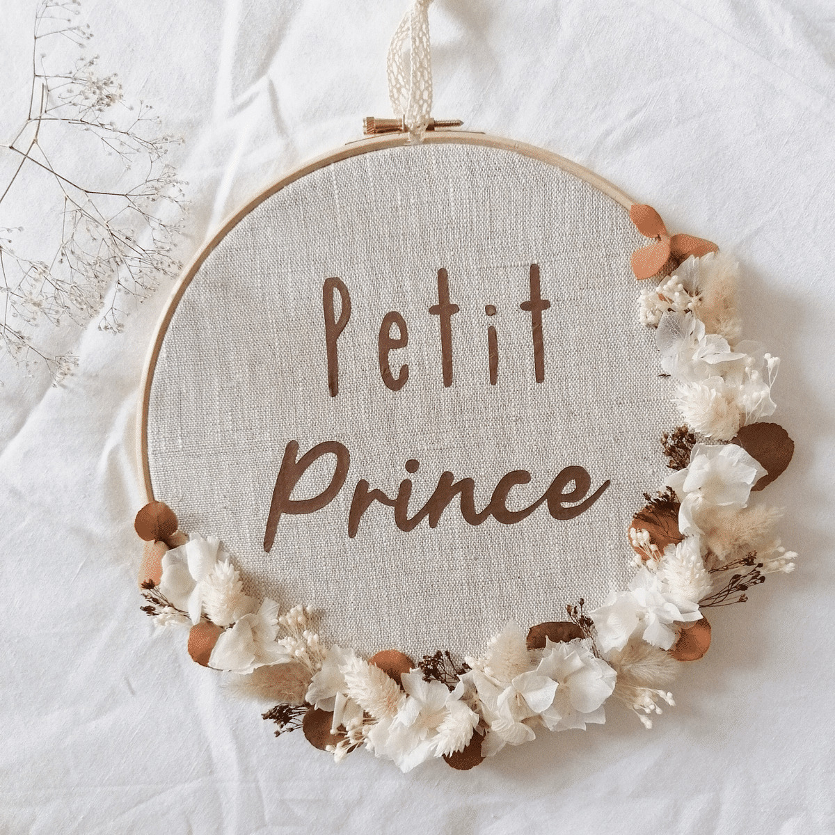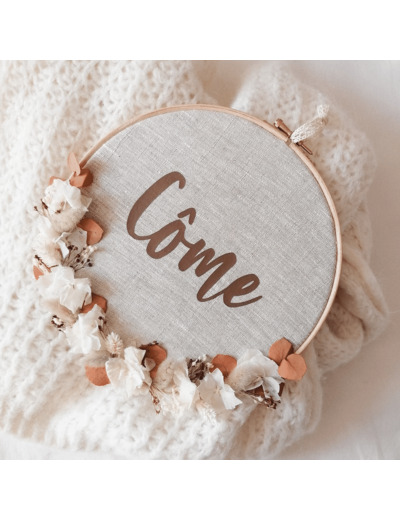Une jolie création sur tambour en bois, personnalisable avec un doux prénom et/ou une date, un mot..