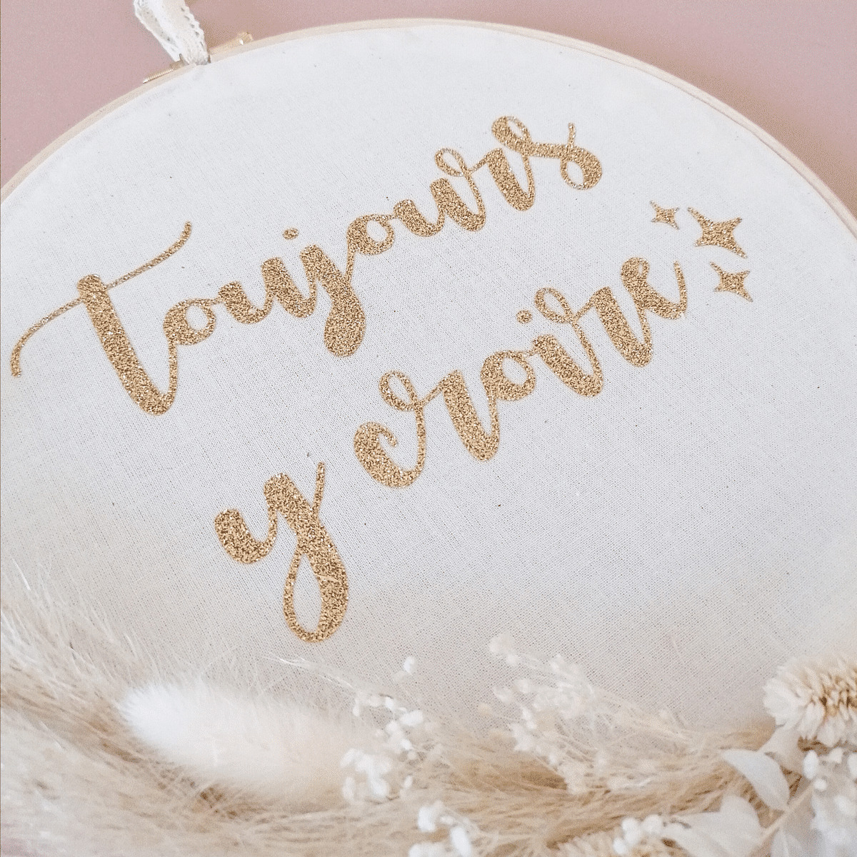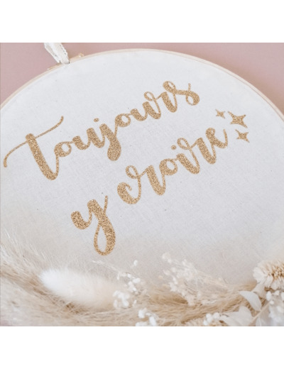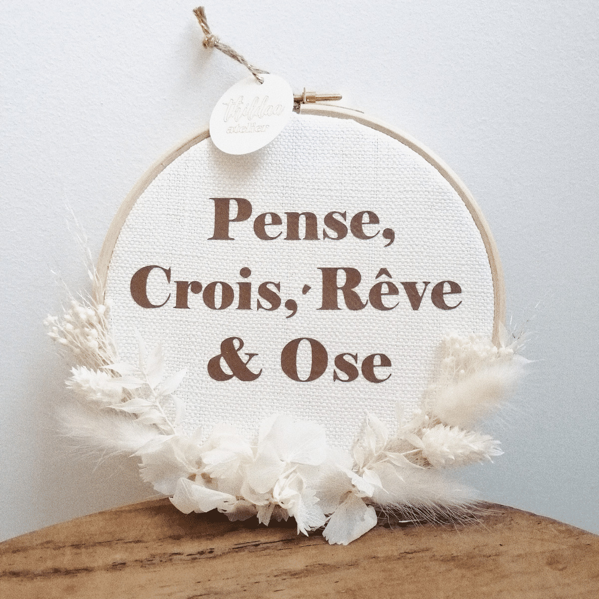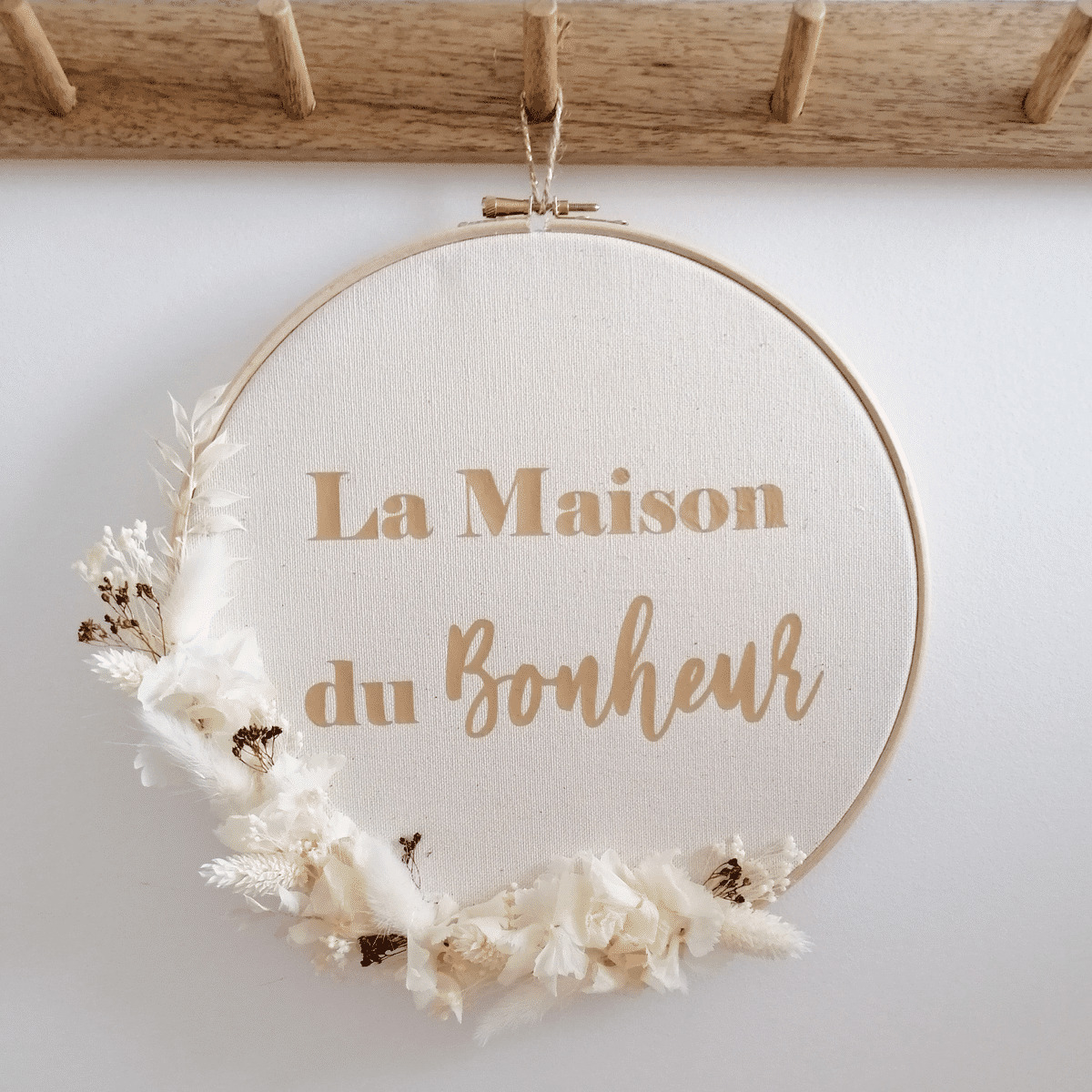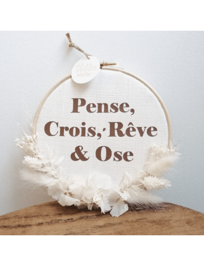 Ornement de fleurs séchées à définir à la fin de votre commande, ainsi que la couleur de votre typo.