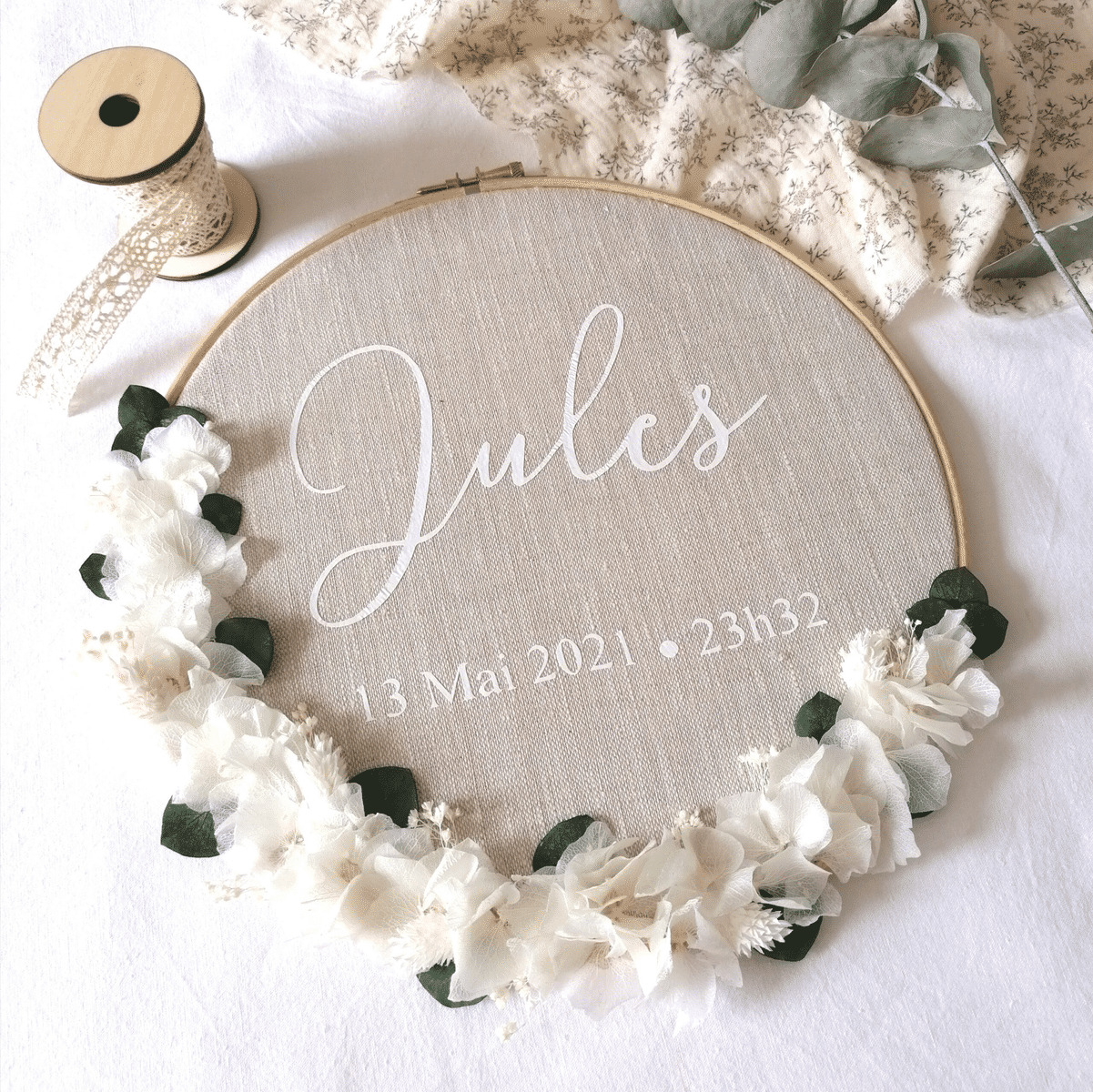 Une jolie création sur tambour en bois, personnalisable avec un doux prénom et/ou une date.