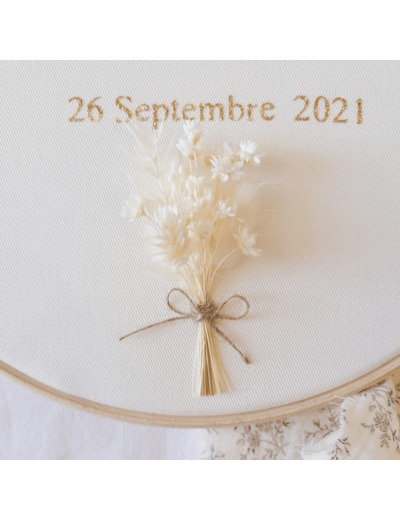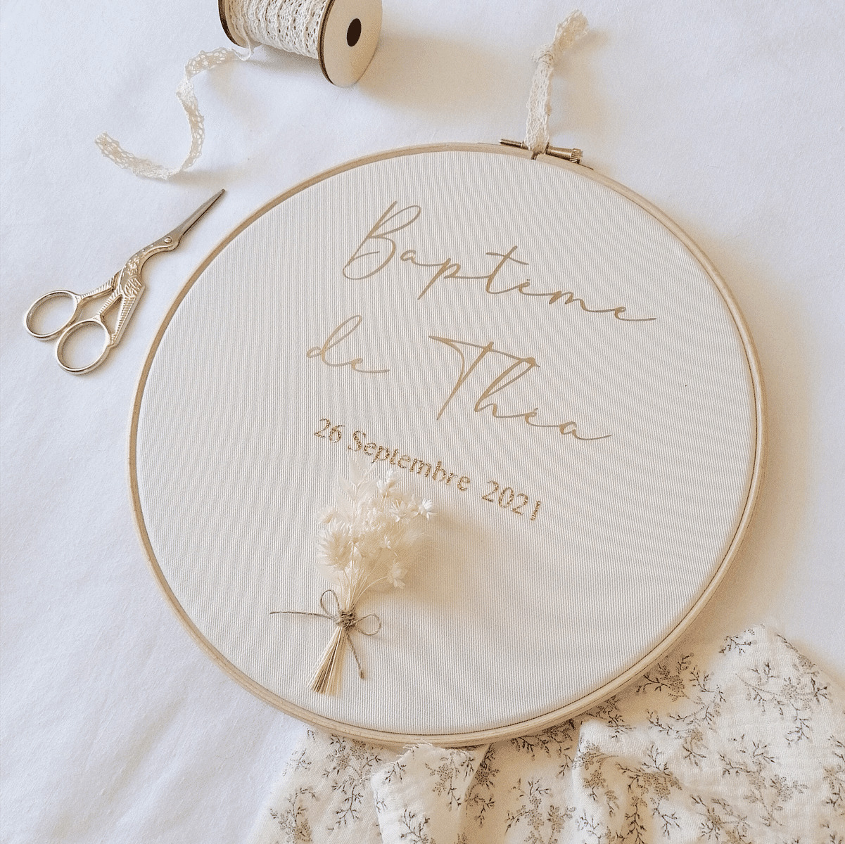 Une jolie création sur tambour en bois, personnalisable avec un doux prénom et une date.