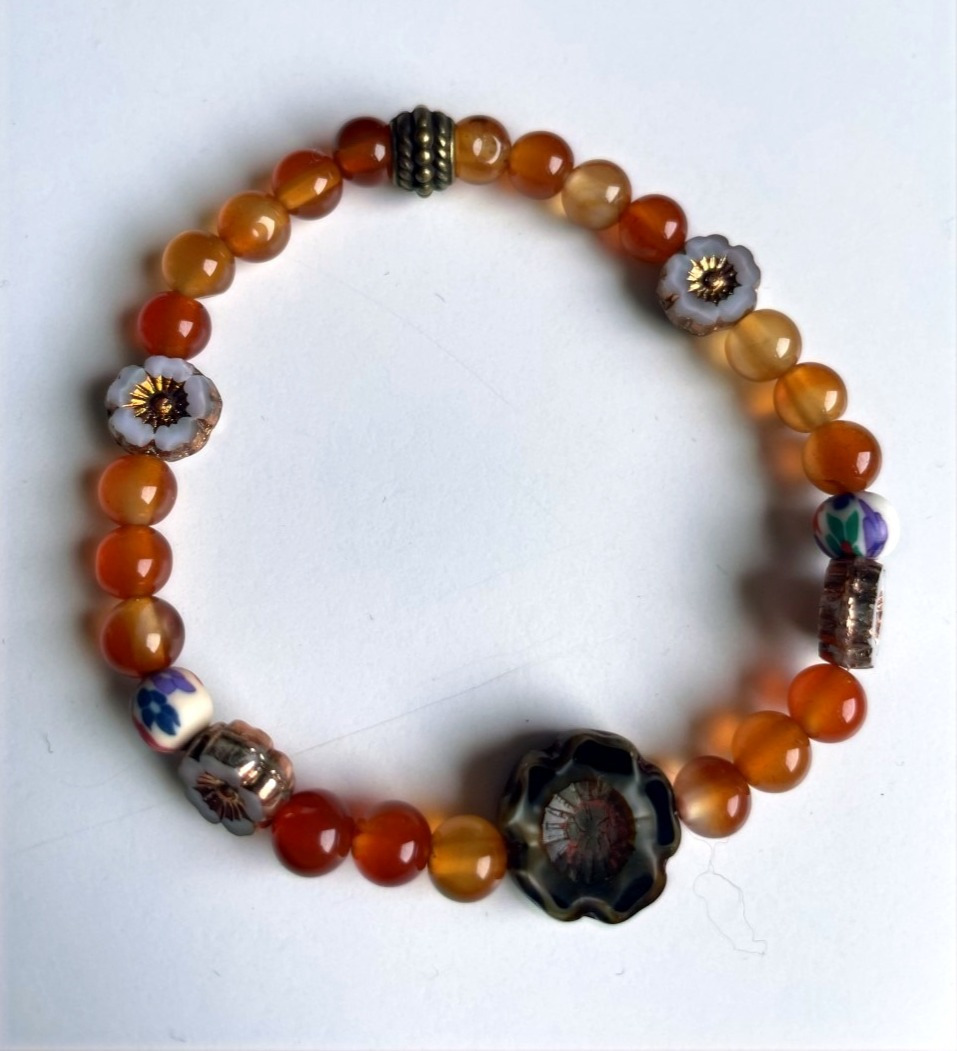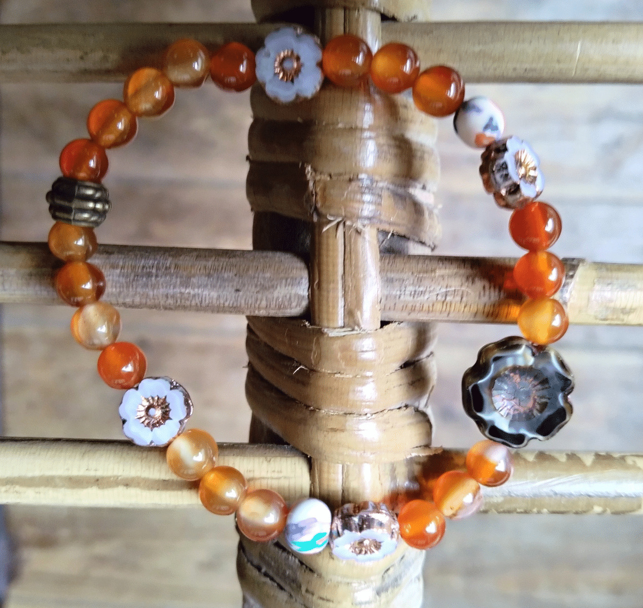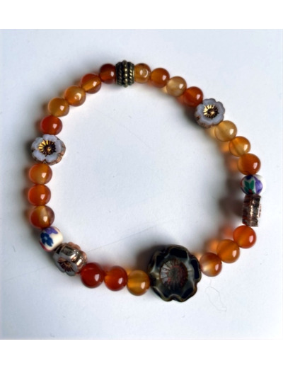 Bracelet en pierre de cornaline , fleurs en verre de bohême .
