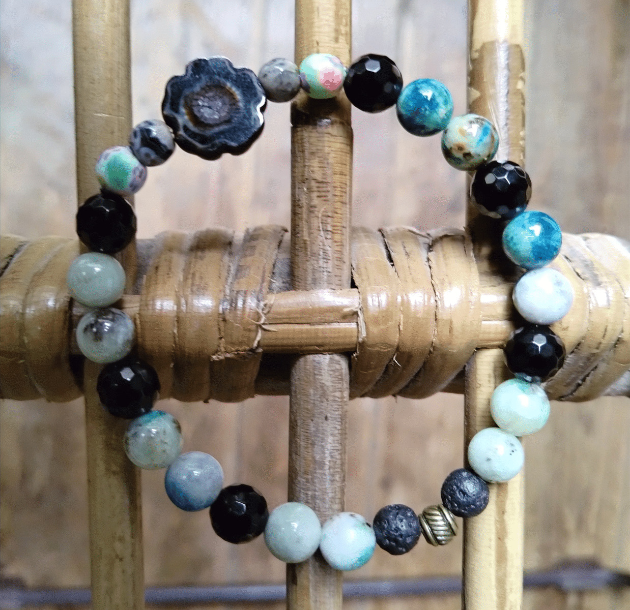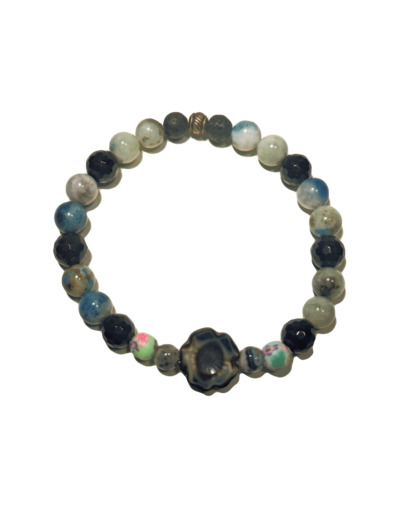 Bracelet en chrysocolla , agate noire facettée , Fleur en verre de bohême , perles de polymère et volcanique .