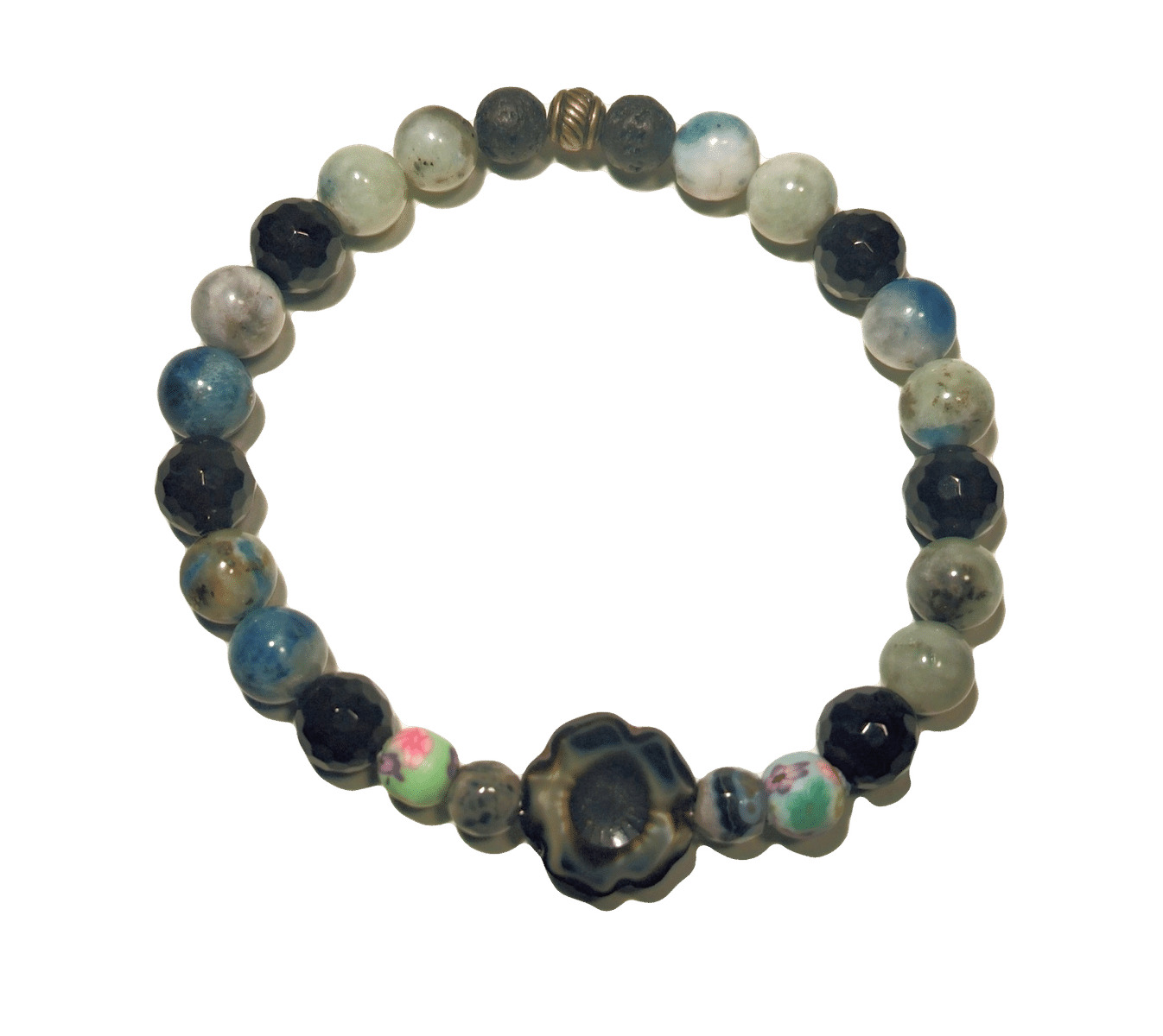 Bracelet en chrysocolla , agate noire facettée , Fleur en verre de bohême , perles de polymère et volcanique .