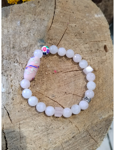 Bracelet en Quartz rose facettée et en cube - Perle centrale de bali et perle en polymère . Q+++