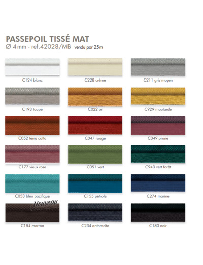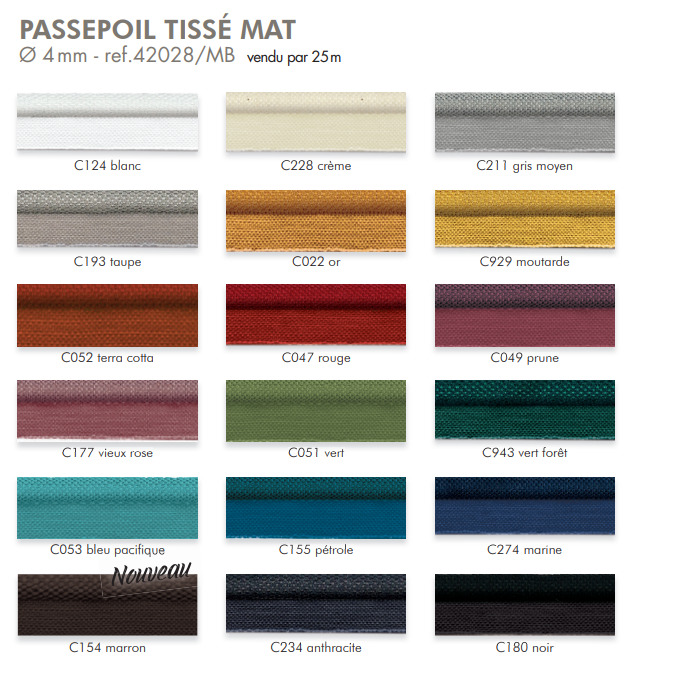 Passementerie utilisée pour border vos coussins de décoration, coussins de bergère etc. … , le modèle 42028 à coudre à son assortie le 42029 à coller . Existe en 18 coloris
