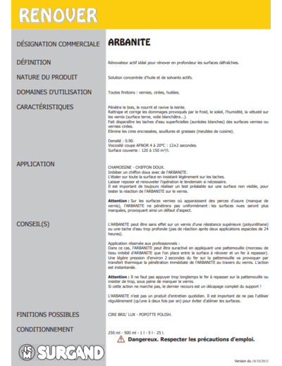 Rénovateur concentré, très efficace pour la rénovation et l'entretien des surfaces vernies et cirées défraîchies. Pénètre le bois, le nourrit et ravive la teinte. Fait disparaître les taches d'eau superficielles (voiles ou auréoles blanchâtres) et corrige les disgrâces dues au froid, à l'humidité et à la vétusté. Elimine les cires encrassées, souillures et les graisses.