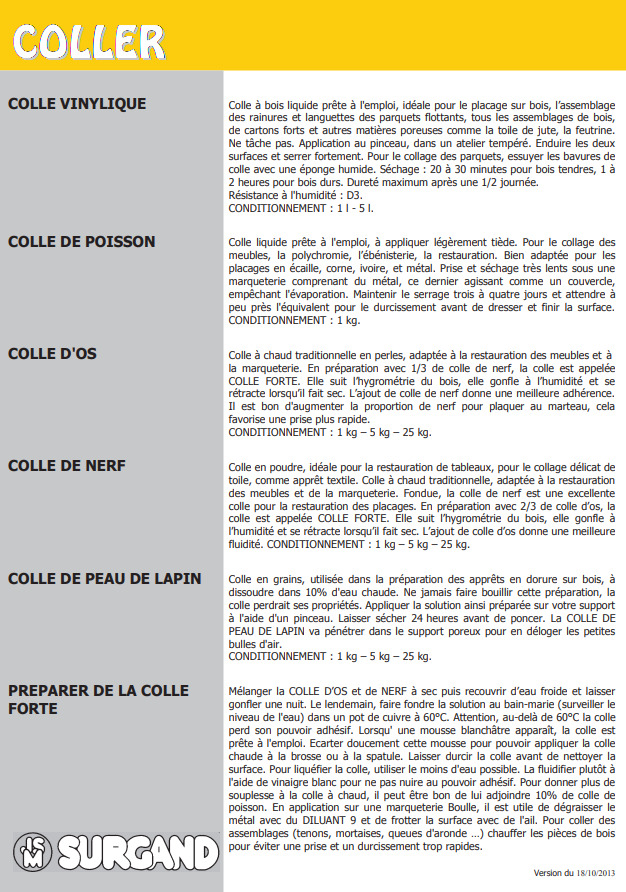 Colle à bois liquide prête à l'emploi, idéale pour le placagesur bois, l'assemblage des rainureset languettes de parquet flottant, tous les assemblages de bois, de cartons forts et autres matières poreuses comme les toiles de jute, la feutrine. Ne tâche pas. Application au pinceau, dans un atelier tempéré. Enduire les deux surfaces et serrer fortement. Pour les collage des parquets, essuyer les bavures de colle avec une éponge humide. Séchage: 20 à 30 minutes pour bois tendres, 1 à 2 heures pour bois durs. Dureté maximum après 1/2 journée. Résistance à l'humidité : D3 conditionnement en 500ml .