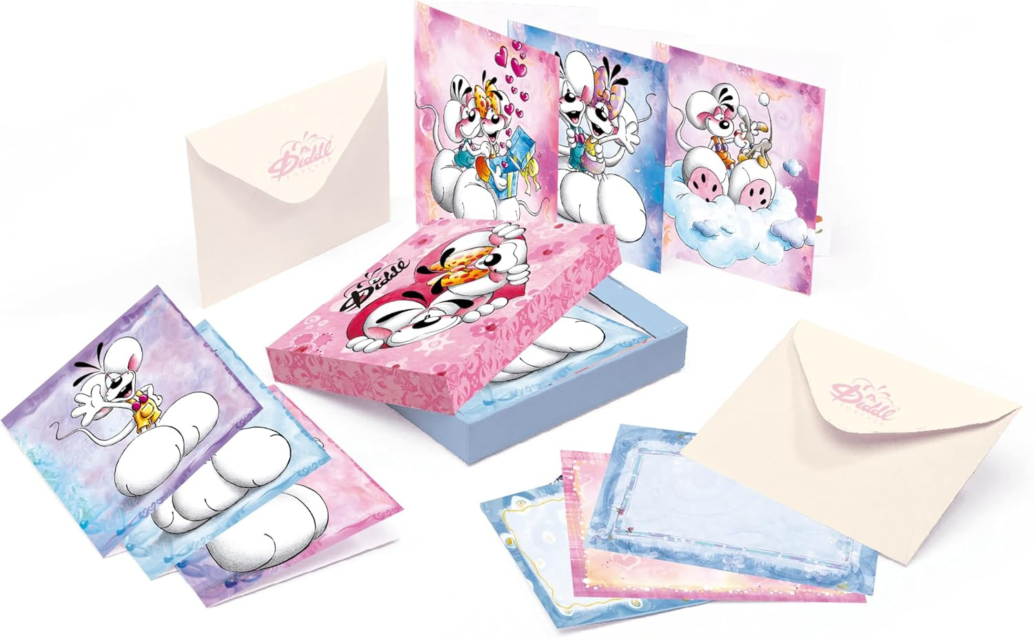 Offrez une touche de tendresse et de nostalgie avec ce Set de Papiers à Lettres Diddl, parfait pour écrire, offrir ou collectionner. Présenté dans une boîte décorative rigide, ce coffret contient : 4 cartes pliées (12,7 x 17,8 cm), 4 enveloppes et 12 feuilles de papier à lettre 12x17,5cm Chaque élément est illustré de jolis motifs de Diddl et ses amis, dans des tons rose, mauve vert et bleu qui rappellent tout le charme de la papeterie des années 90. C’est un coffret idéal pour les amateurs de correspondance, les collectionneurs ou les fans de l’univers Diddl. La boîte peut également être conservée comme objet déco ou pour ranger d'autres accessoires de papeterie. 🎁 Une idée cadeau originale et douce, à offrir pour un anniversaire, une fête ou simplement faire plaisir à une personne sensible au charme vintage.