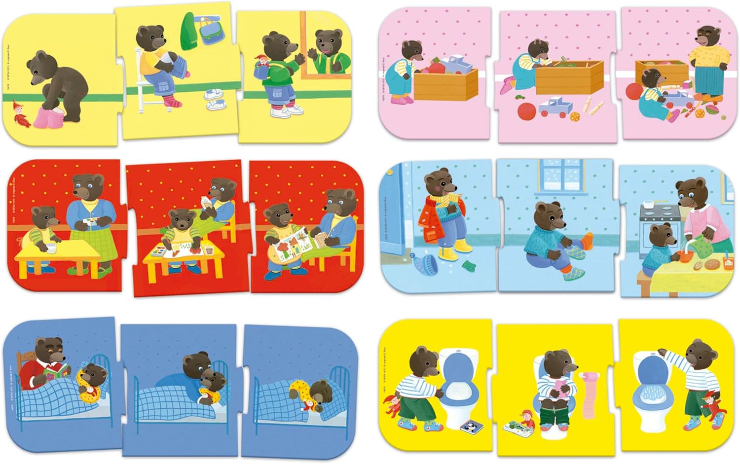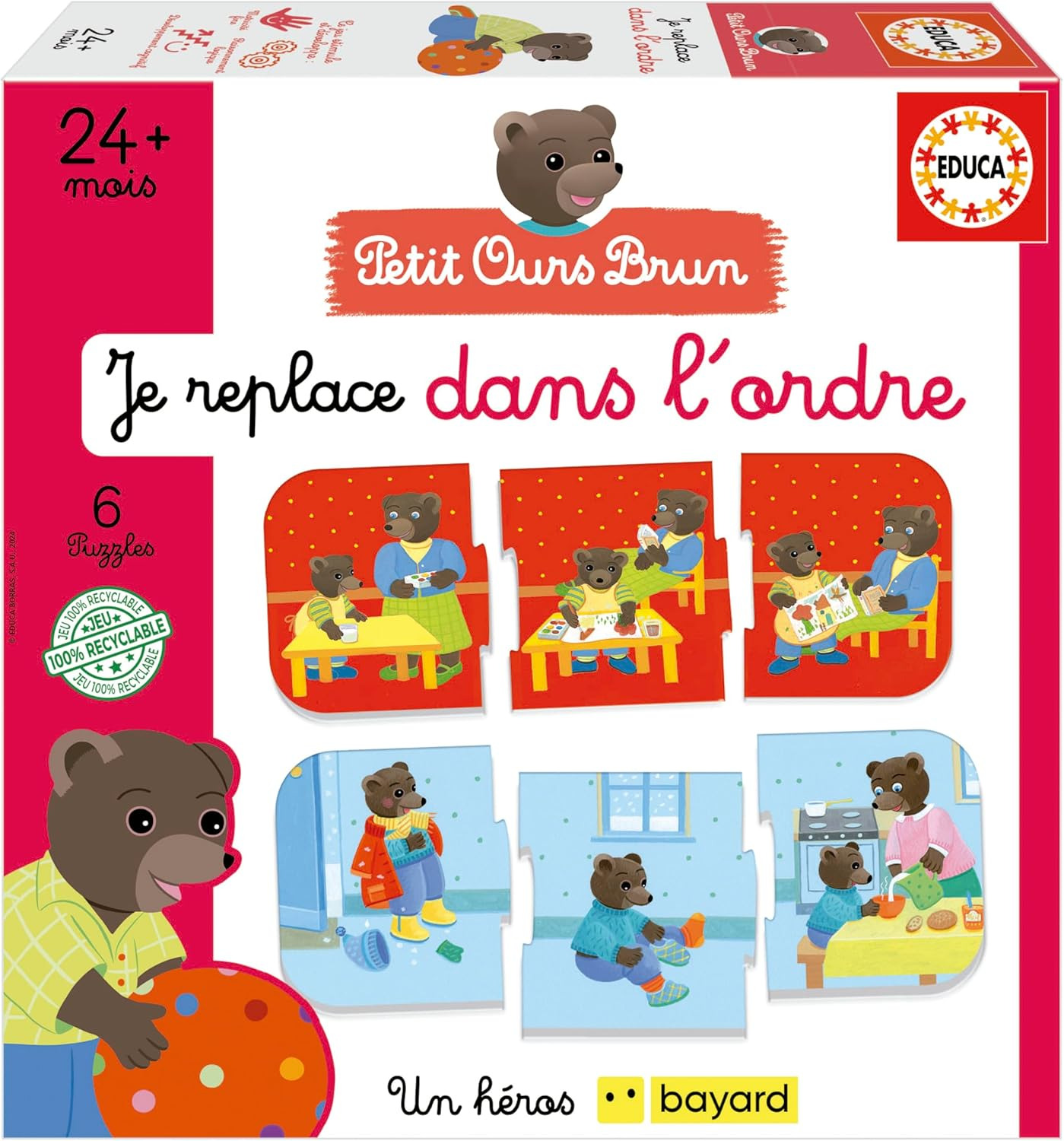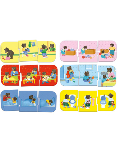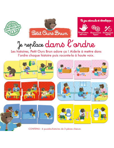 Petit Ours Brun est l´ours le plus observateur. Mais pour pouvoir expliquer une histoire, il doit d´abord la mettre dans le bon ordre. Avec ton aide, il est sûr de réussir ! Ce jeu stimule et développe la motricité fine, le raisonnement logique et le développement cognitif. Contenu : 6 séries avec 3 pièces à assembler dans chacune d´elles. AVERTISSEMENT DE SÛRETÉ Aucun avertissement applicable