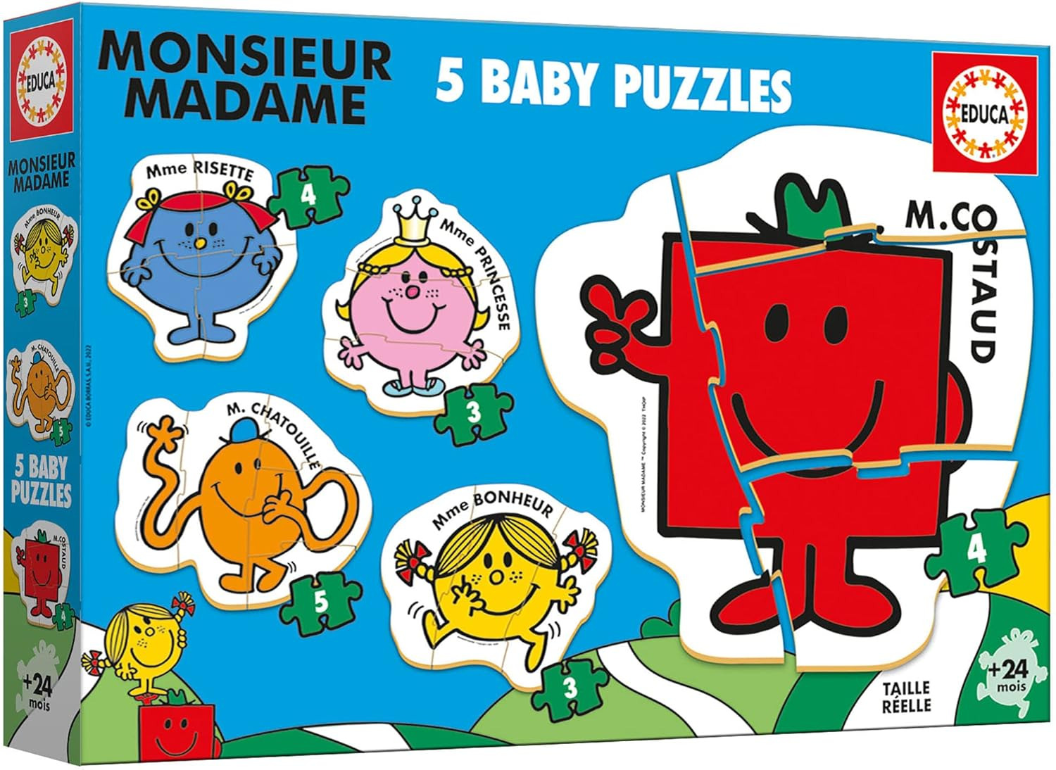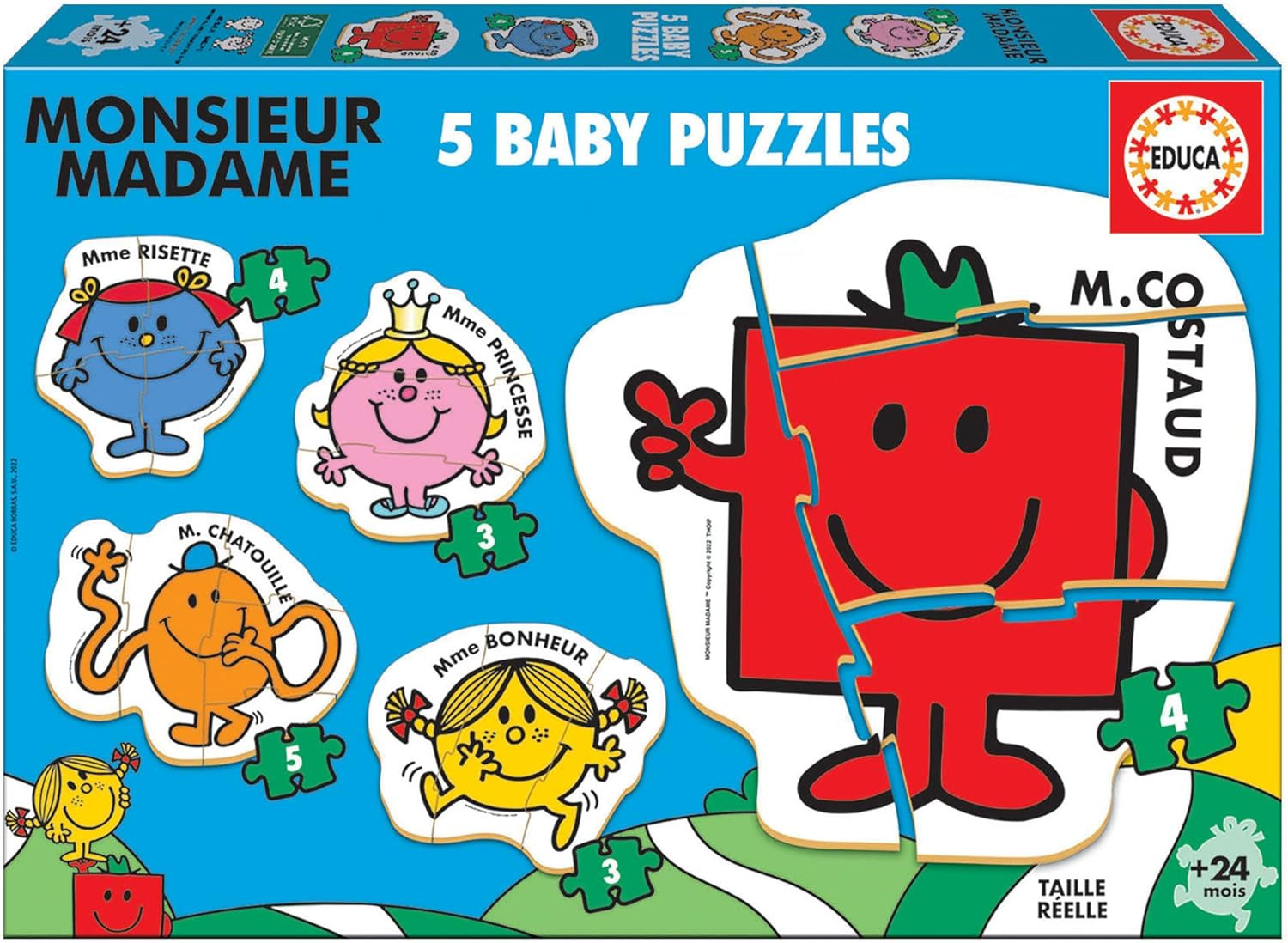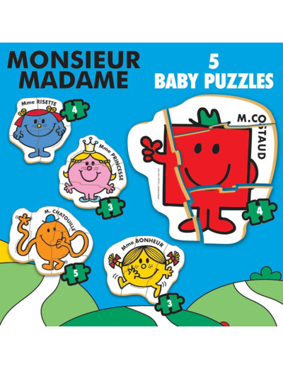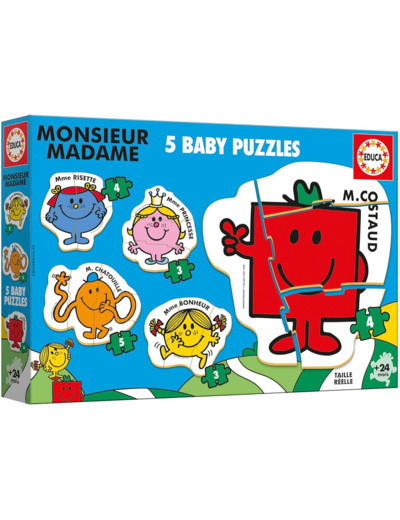 5 puzzles progressifs de 3 à 5 pièces. Composés de grandes pièces, épaisses et faciles à manipuler, ils développent l´attention, la psychomotricité, la curiosité et l'imagination des plus petits. AVERTISSEMENT DE SÛRETÉ Aucun avertissement applicable