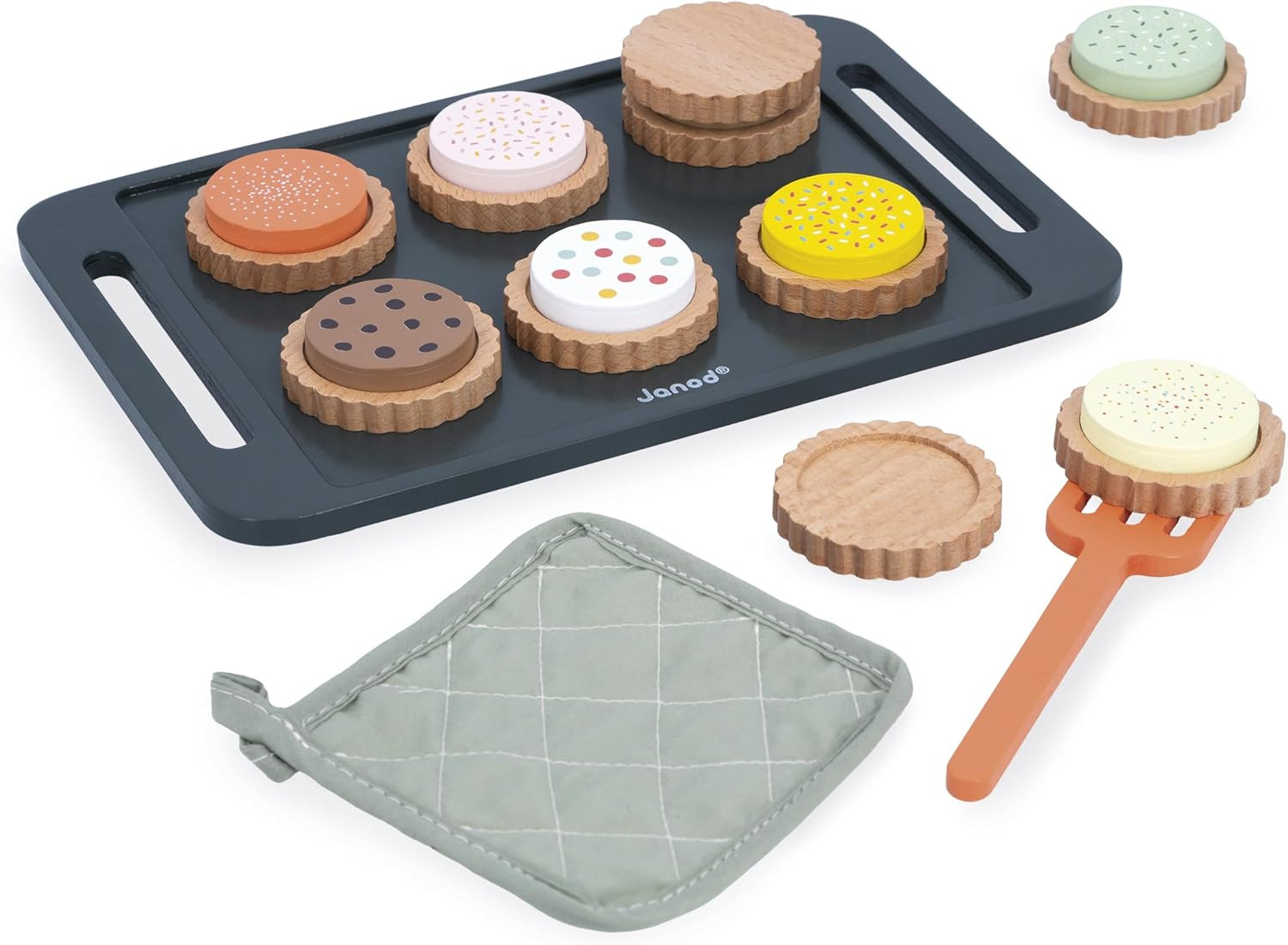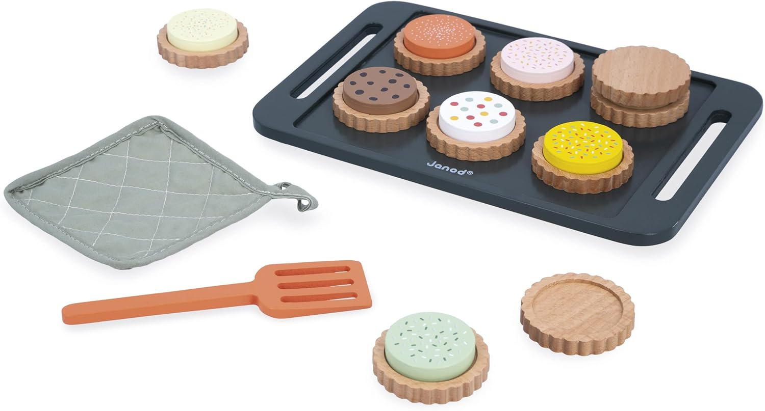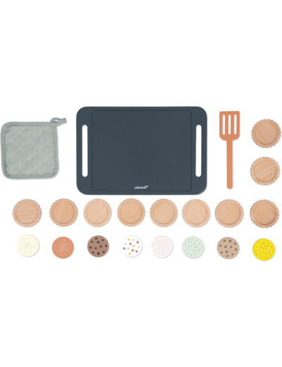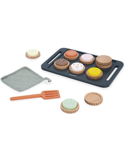 Les petits cuistots sont aux fourneaux, les biscuits sont bientôt cuits ! Quoi de mieux que ce set de biscuits pour imiter les plus grands chefs ? Ce set composé d'un plateau, d'une spatule, d'une manique ainsi que 10 biscuits et 8 saveurs différentes, a tout le nécessaire pour pouvoir créer les meilleures gourmandises. Jouet d'imitation en bois FSC™, pour les enfants à partir de 3 ans. AVERTISSEMENT DE SÛRETÉ Ne convient pas aux enfants de moins de 36 mois.