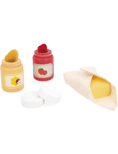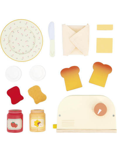 Quelle délicieuse odeur de pain grillé pour commencer la journée en douceur ! Ce set de petit-déjeuner offre tout le nécessaire pour imiter un vrai matin gourmand : des tranches de pain de mie prêtes à griller, du beurre à tartiner, une confiture de fraise sucrée, et même du miel pour les amateurs. Placez les tartines dans le grille-pain, ajustez la température à l’aide du bouton rotatif et appuyez : hop, les tartines sautent comme dans une vraie cuisine ! Une assiette élégante et un couteau à beurre complètent ce kit parfait. Ce jouet d’imitation en bois FSC™, conçu pour les enfants dès 3 ans, stimule leur imagination et leur motricité fine tout en leur permettant de s’initier aux gestes du quotidien. Une belle façon de jouer tout en apprenant à reproduire les rituels des grands ! AVERTISSEMENT DE SÛRETÉ Ne convient pas aux enfants de moins de 36 mois.