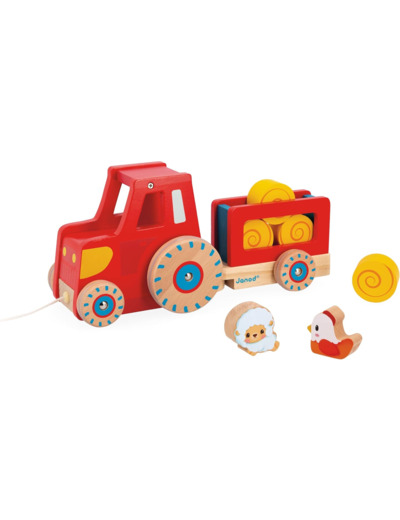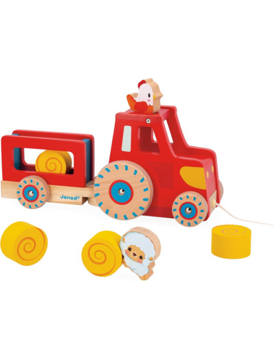 Vroum ! C'est l'heure de charger le tracteur rouge pour aller nourrir la poule et le mouton ! À l'aide des animaux de la ferme et d'un joli tracteur rouge, votre tout-petit dès 1 an fait le plein de découvertes et d'apprentissages. L'aventure a sonné pour les tout-petits dès 12 mois qui grandissent en s'amusant. Avec ses pièces faciles à manipuler qui s'ancrent dans l'univers coloré de la ferme, ce jeu d'éveil stimule l'imagination et la dextérité des enfants de 1 à 3 ans. Grâce à sa ficelle en coton, le tracteur Janod se transforme en jouet à tirer et favorise la motricité globale. Tel un compagnon de marche, il peut accompagner bébé dans ses premiers pas et dans toutes ses aventures. Pratique, les roues silencieuses en silicone protègent les oreilles et les sols. La remorque amovible se détache comme une vraie et peut contenir les bottes de foin pour plus de jouabilité. Contient 1 tracteur avec remorque, 1 mouton, 1 poule, 4 bottes de foin. Jeu en bois FSC et peinture à l'eau. Dimensions : 26,5 x 9,5 x 12,4 cm. Jeu Janod pour enfants de 12 à 36 mois. AVERTISSEMENT DE SÛRETÉ Aucun avertissement applicable
