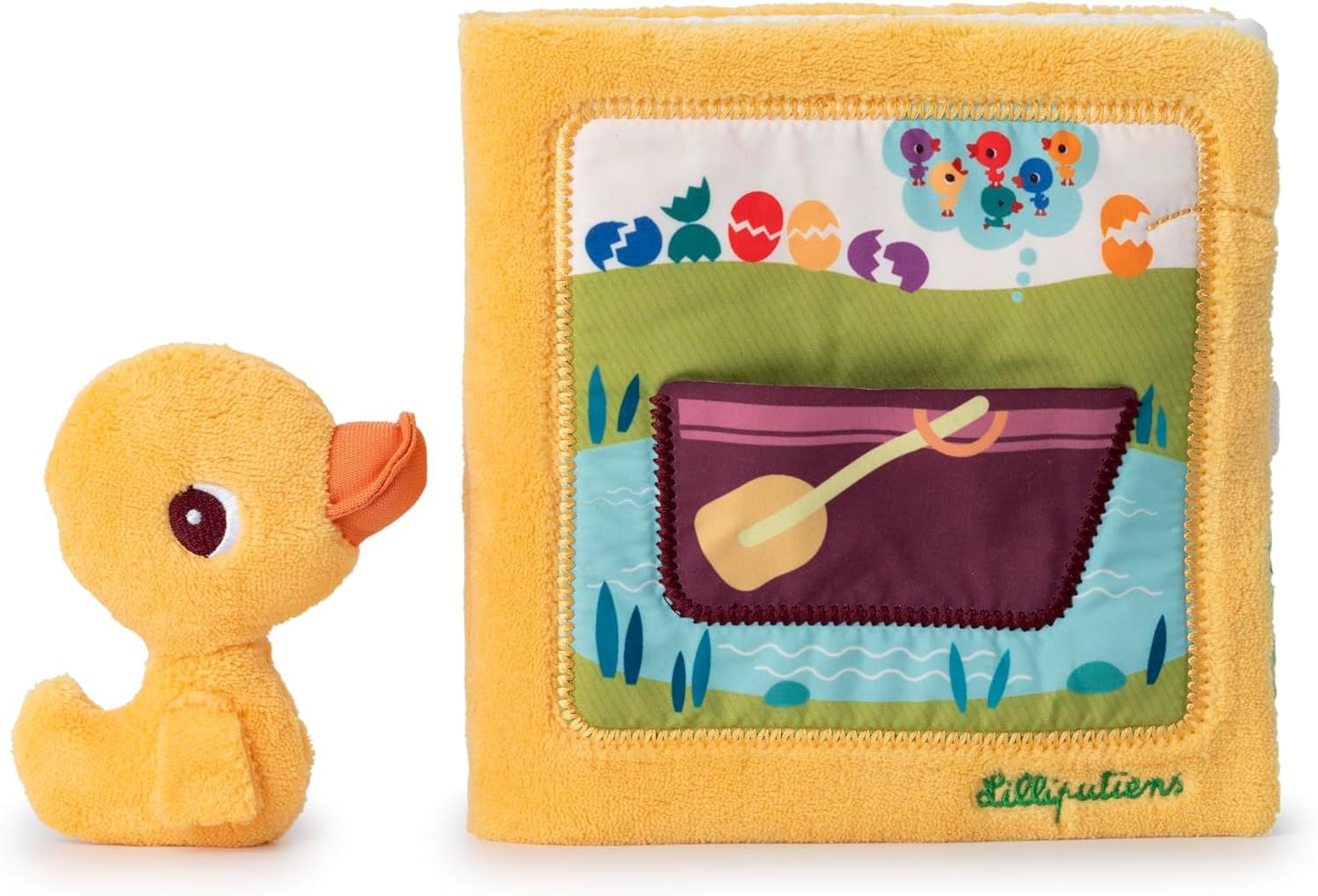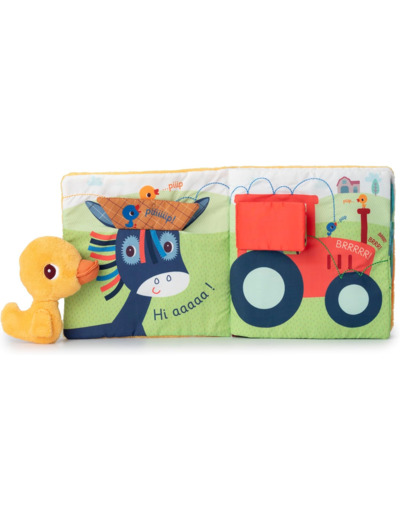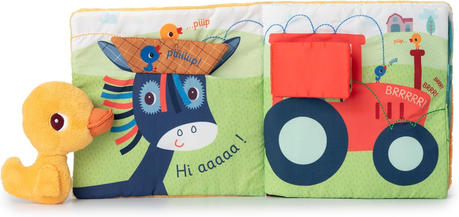 Livre en tissu – À la recherche des cannetons avec Gaspard le canard! Gaspard le canard a perdu ses petits ! Ce livre d’activités en tissu entraîne les enfants dès 18 mois dans une tendre aventure à travers la ferme, pour retrouver les canetons éparpillés après l’éclosion. Coloré, interactif et plein de surprises, il stimule les sens et l’imagination. Accompagné d’une peluche canard à manipuler, l’enfant explore chaque page riche en textures, volets à soulever et bruit de papier, tout en découvrant les habitants de la ferme. C’est l’occasion idéale d’apprendre les couleurs, de nouveaux mots, et de développer la reconnaissance visuelle et tactile. L’histoire se termine autour d’un bon goûter en famille : un moment de partage et de complicité. Ce livre carré au format 20x20 cm est facile à manipuler par les petites mains, et lavable en machine à 30°, pour de nombreuses aventures tout en douceur.
