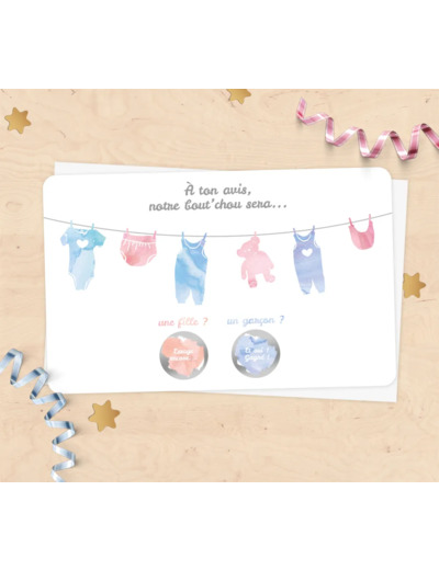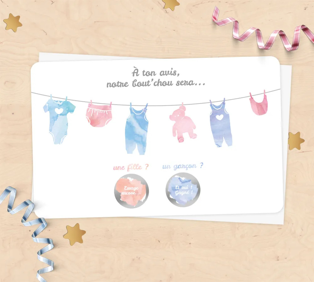 Cette carte à gratter au design aquarelle “fil à linge” est parfaite pour révéler de manière ludique si votre bout’chou est une fille ou un garçon. Glissez-la dans une enveloppe (fournie), offrez-la à vos proches… et laissez la surprise se dévoiler en grattant la pastille !