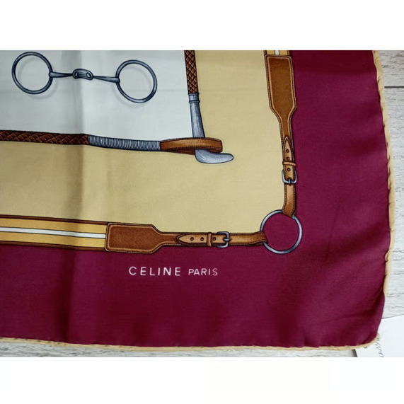 Céline carré soie 90cm, l'étiquette est présent, couleurs prédominants bordeaux, moutarde, crème.