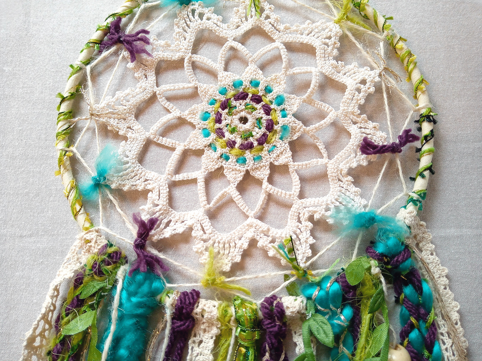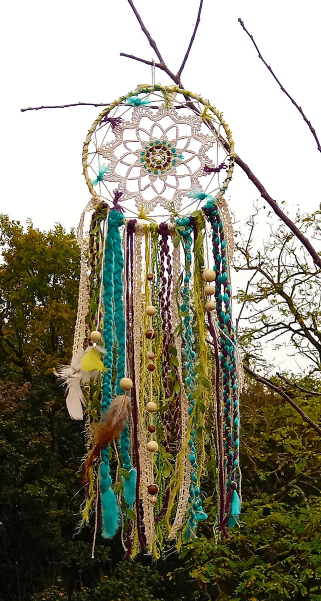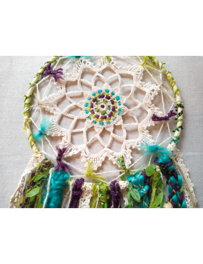 Attrape-rêves réalisés avec une association de tissu, ruban, dentelle, laine, perles, plumes... @Couleurs : écru, vert, bleu, prune, doré @Diamètre : 19 cm, longueur : 55 cm env.