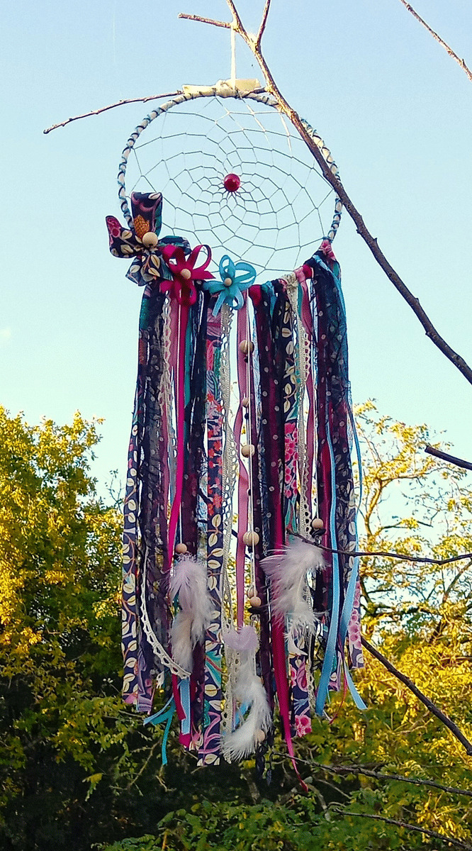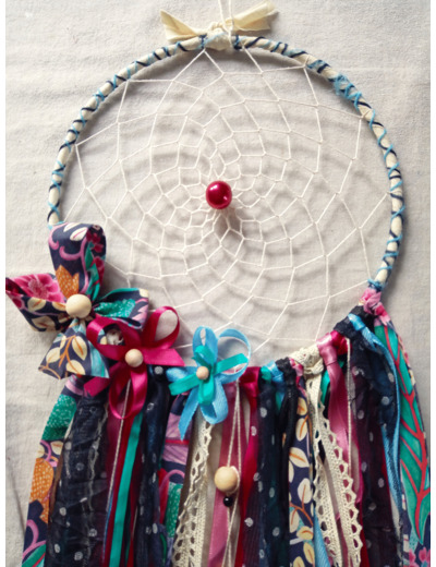 Attrape-rêves réalisés avec une association de tissu, ruban, dentelle, laine, perles, plumes... @Couleurs : multicolore @Diamètre : 19 cm, longueur : 55 cm env.
