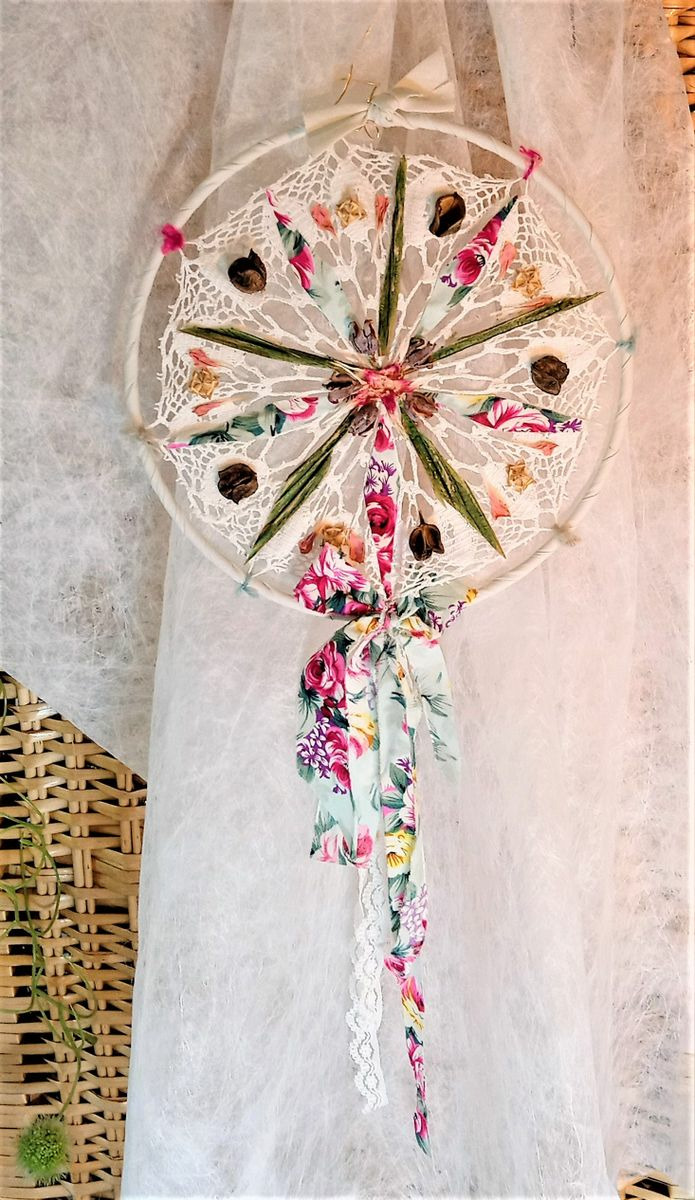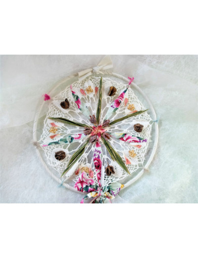 Attrape-rêves réalisé sur un support en dentelle au crochet, sur le thème de l'été, avec une association de végétaux et graines séchées, tissu, ruban...