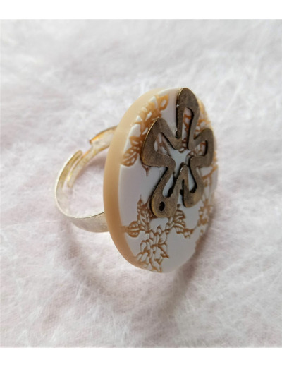 Bague réalisée avec un bouton blanc et beige en résine gravée, motif végétal et agrémenté d'une estampe métallique motif fleur couleur bronze.
