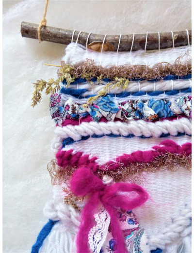 tissage mural réalisé avec une association de matériaux: laine, tissu, ruban, végétal... Il apportera une touche décorative joyeuse et lumineuse dans votre maison.