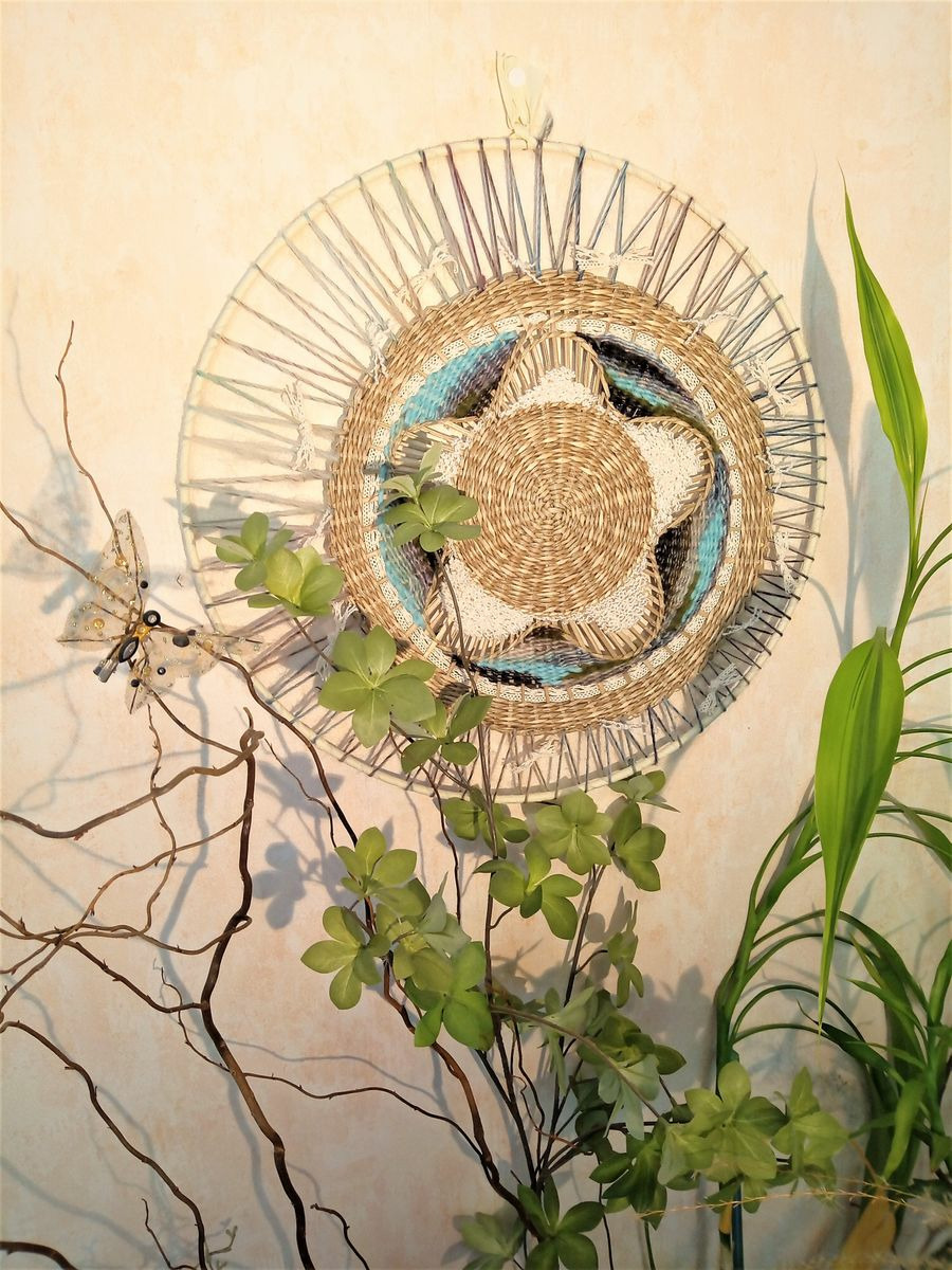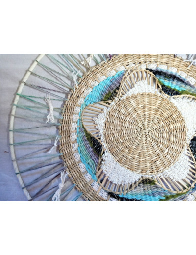 tissage circulaire réalisé sur un support en jonc tissé avec une association de dentelles et laines dans des tons turquoise/mauve/beige/kaki/noir/écru