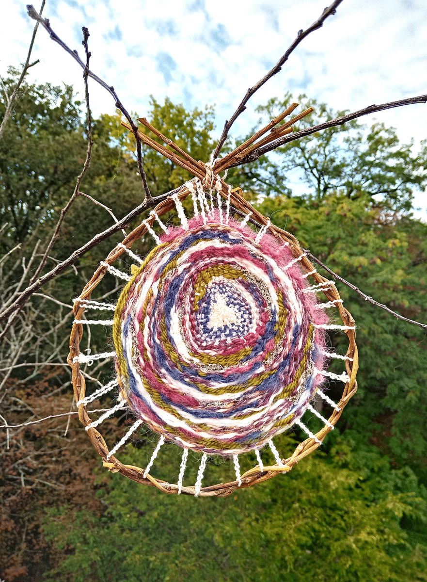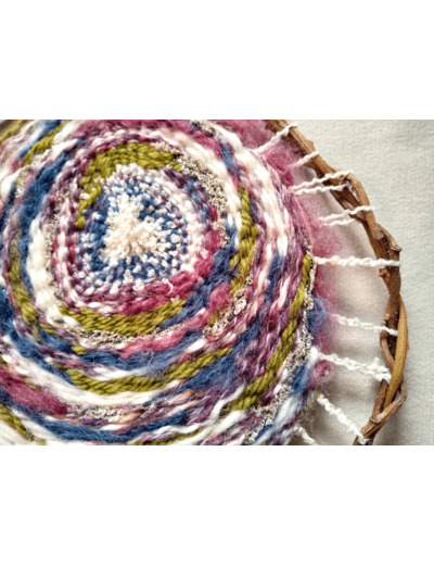 tissage réalisé sur un support en saule tressé, tissé avec une association de laines dans des tons bleu, vert, écru, lie de vin, argenté