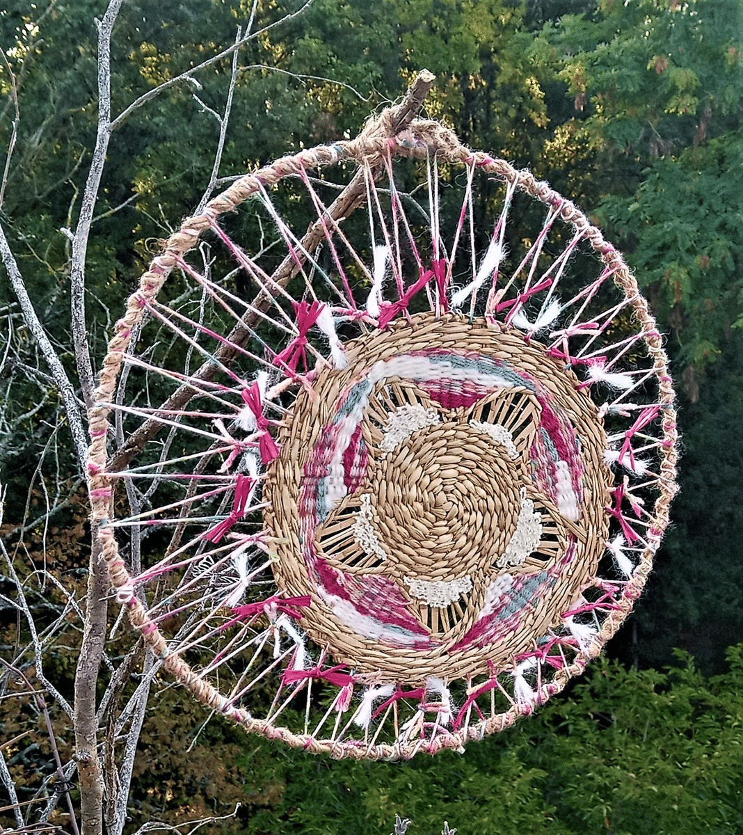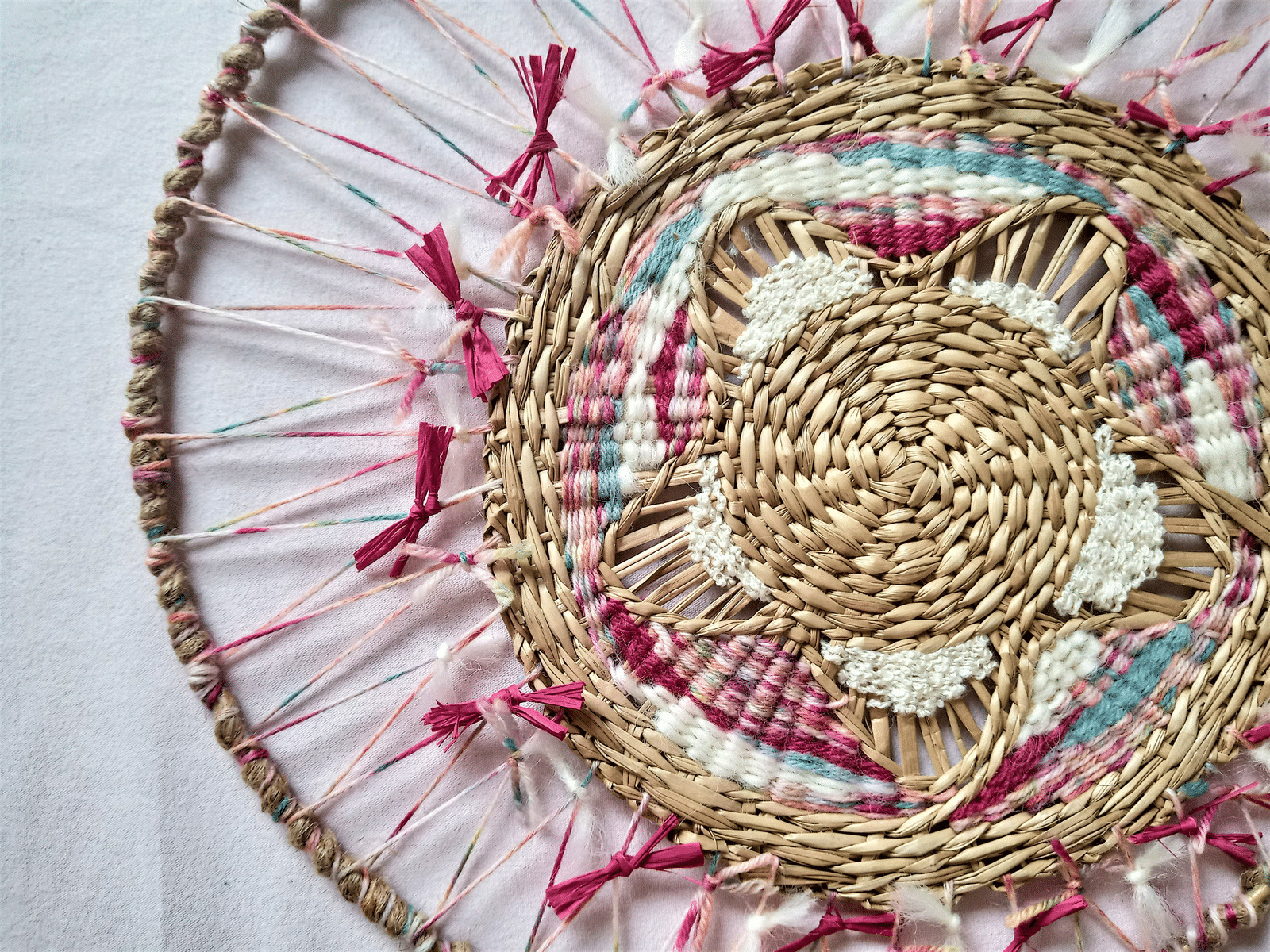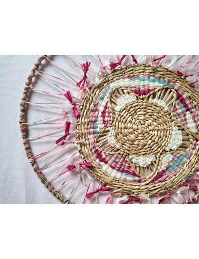 tissage circulaire réalisé sur un support en jonc tissé avec une association de laines/rafia/ficelle dans des tons rose/turquoise/écru