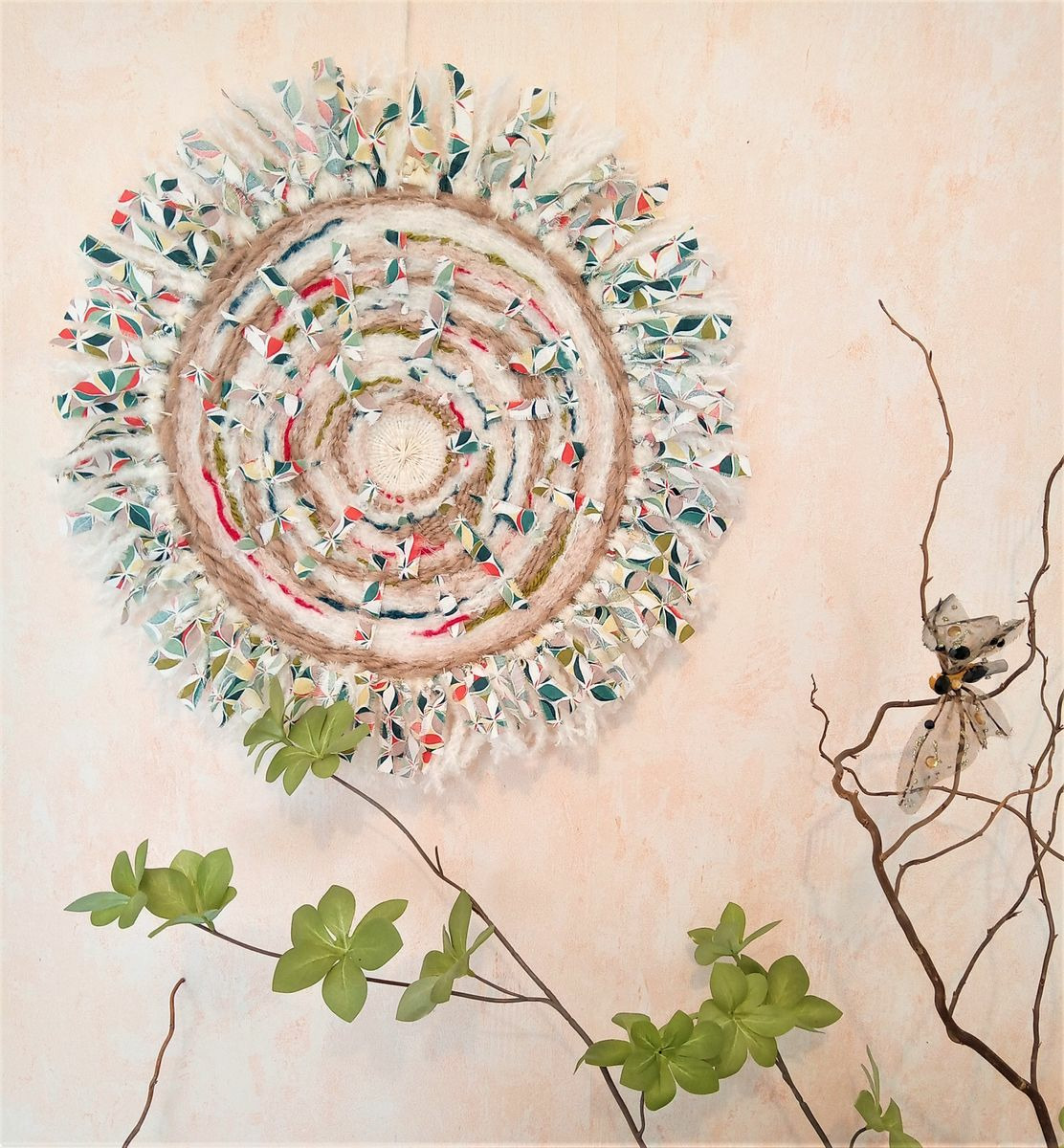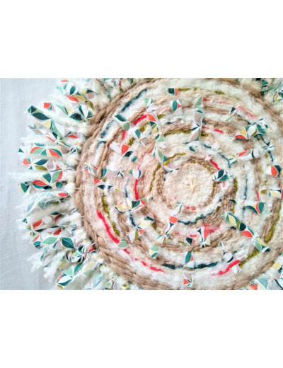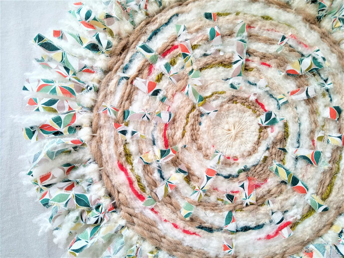 tissage circulaire réalisé avec une association de laines et tissu dans des tons écru/beige/rouge/bleu/vert