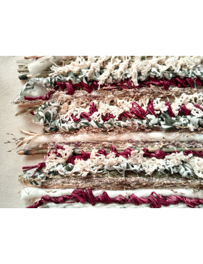 tissage mural associant des matériaux variés: laine, tissu, rafia, dentelle, végétal dans des teintes pourpre, vert, beige, écru.
