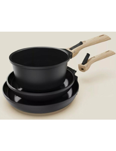 Le kit cuisine 7 pièces COOKUT.inclut deux poêles (Ø 24 cm et Ø 28 cm), une casserole (Ø 20 cm), deux poignées amovibles et deux feutrines de protection, alliant praticité et performance.