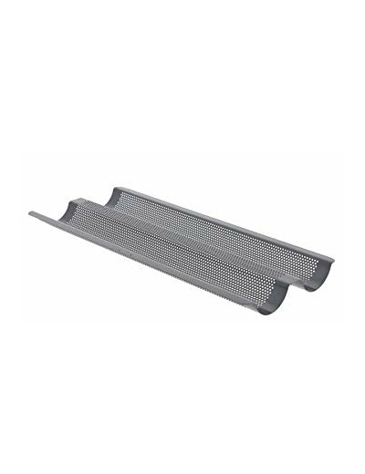 Idéale pour la cuisson des baguettes, la réalisation de tuiles arrondies ou de décors en chocolat. Les perforations permettent une circulation optimale de l’air chaud. La plaque de cuisson perforée est en acier revêtu pour 2 baguettes. Revêtement PTFE garanti sans PFOA pour un décollement facile des pâtisseries, sans cassure ni déchirure ; une protection de l’acier contre l’oxydation. Cuisson traditionnelle au four (220°C max.)