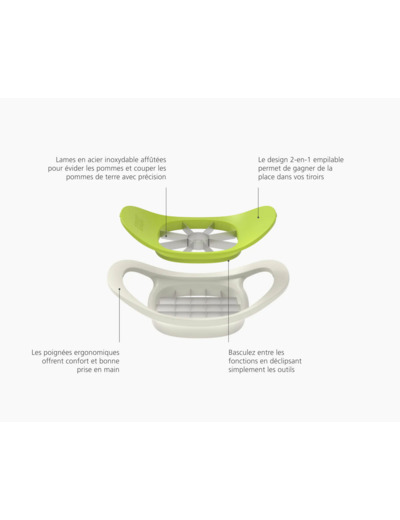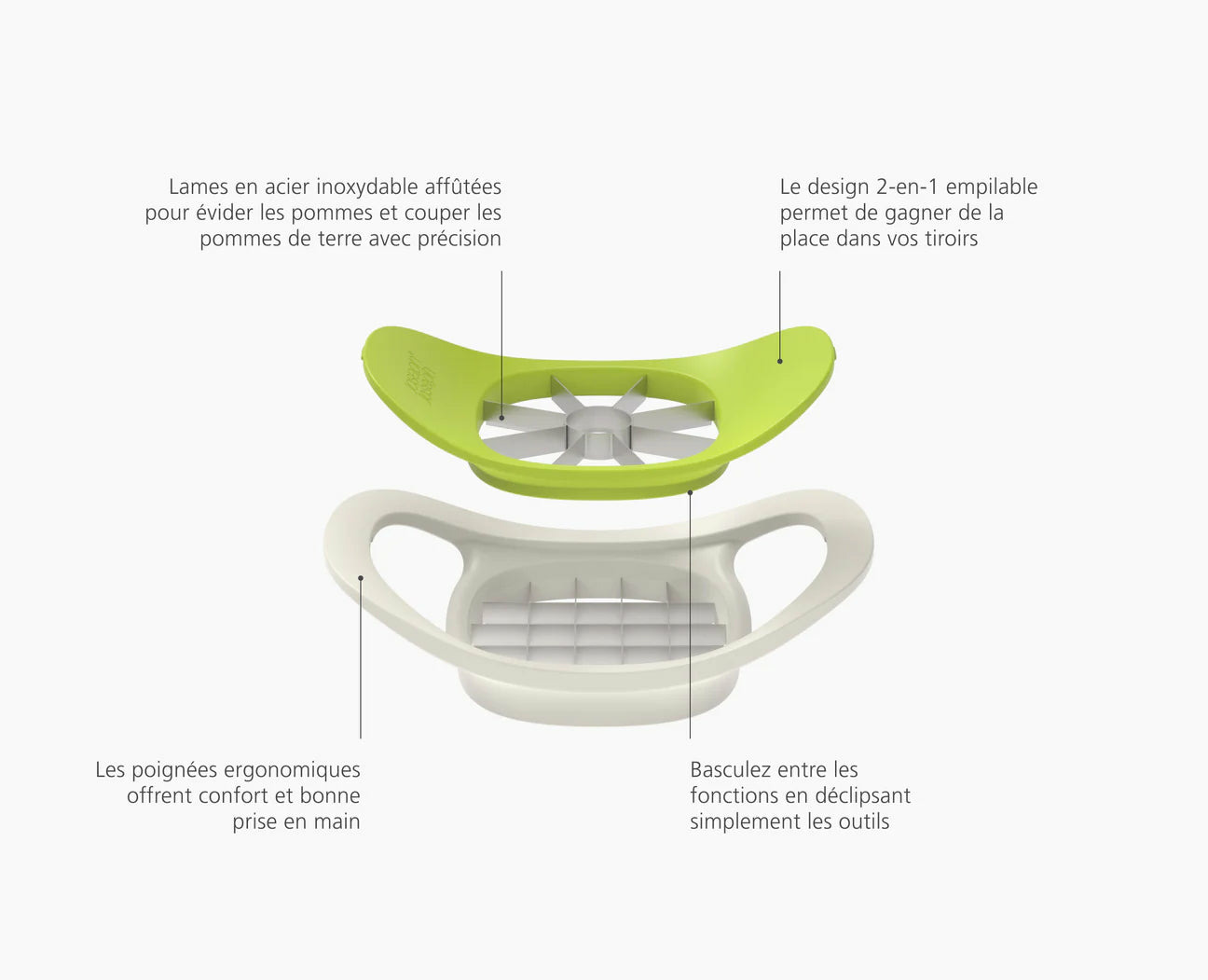 Simplifiez la préparation des aliments avec cet outil 2-en-1 pour évider et couper en frites. Passez facilement d'une fonction à l'autre, pour évider des pommes ou couper des pommes de terre en frites, puis rangez les deux outils ensemble grâce à leur conception empilable pour un stockage compact.