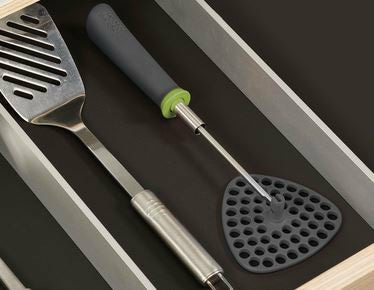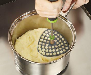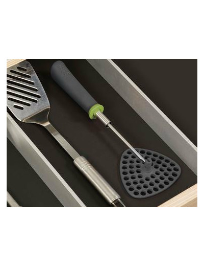 La tête de cet astucieux presse-purée peut être pliée et aplatie afin d'être correctement rangée dans un tiroir.