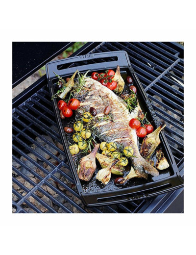 Cette Plancha en fonte émaillée avec poignées permet de griller, saisir et cuire : viandes, poissons, légumes...
