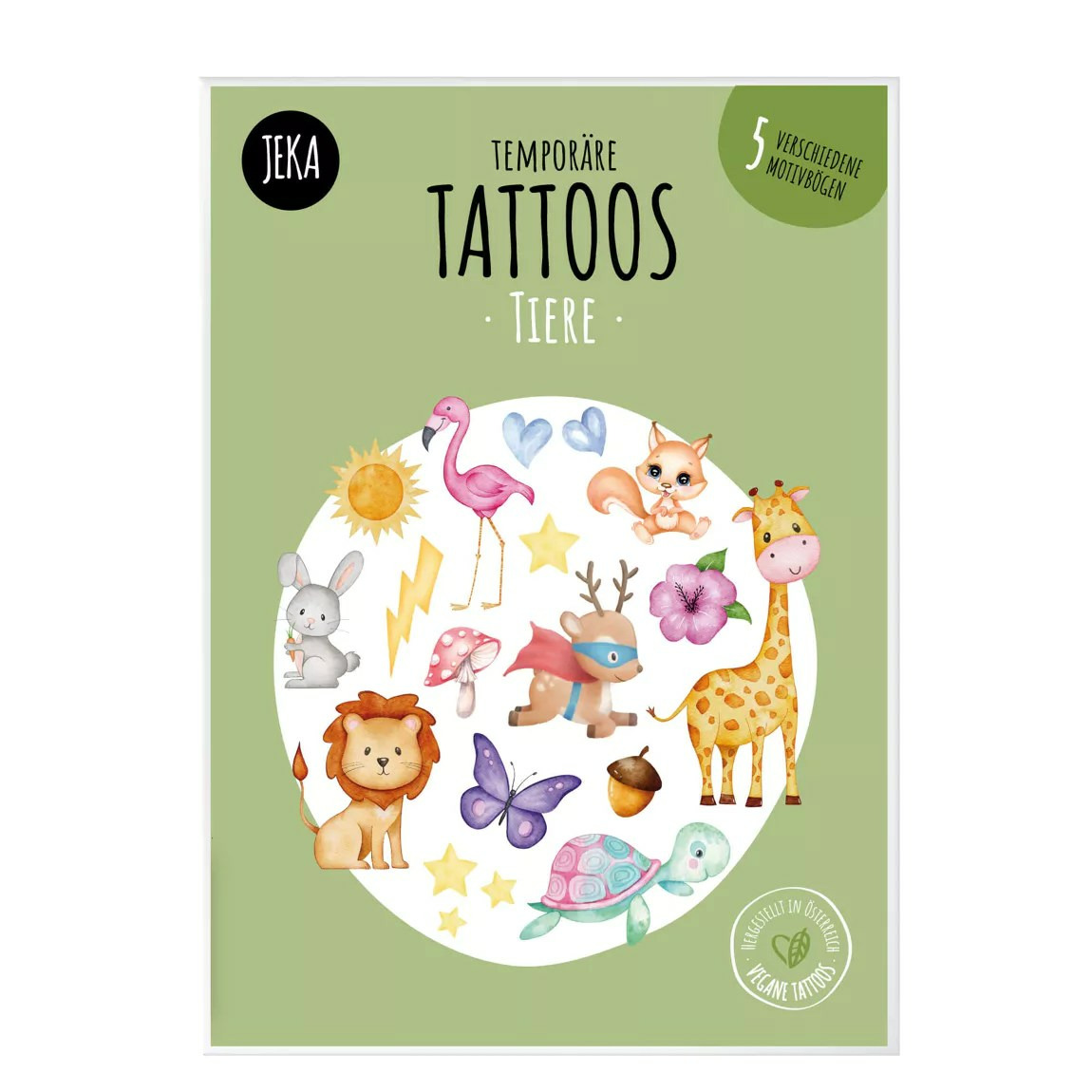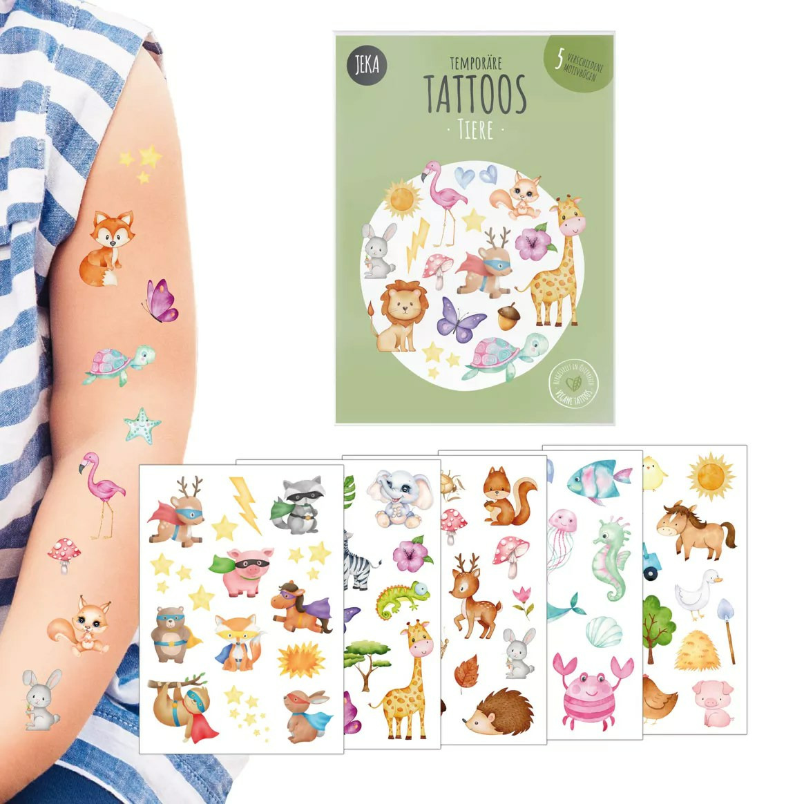 Nos tatouages colorés et originaux de la marque vegan et éco-responsable Jeka sont un jeu d'enfant à utiliser et à enlever. A l'intérieur du paquet, 5 planches de tatouages éphémères bio. Découpez le modèle qui vous plaît, enlevez la pellicule, un peu d'eau, appliquez une minute sur la peau et hop... le tour est joué! La garantie pour vos enfants de passer un moment ludique en famille ou entre amis.