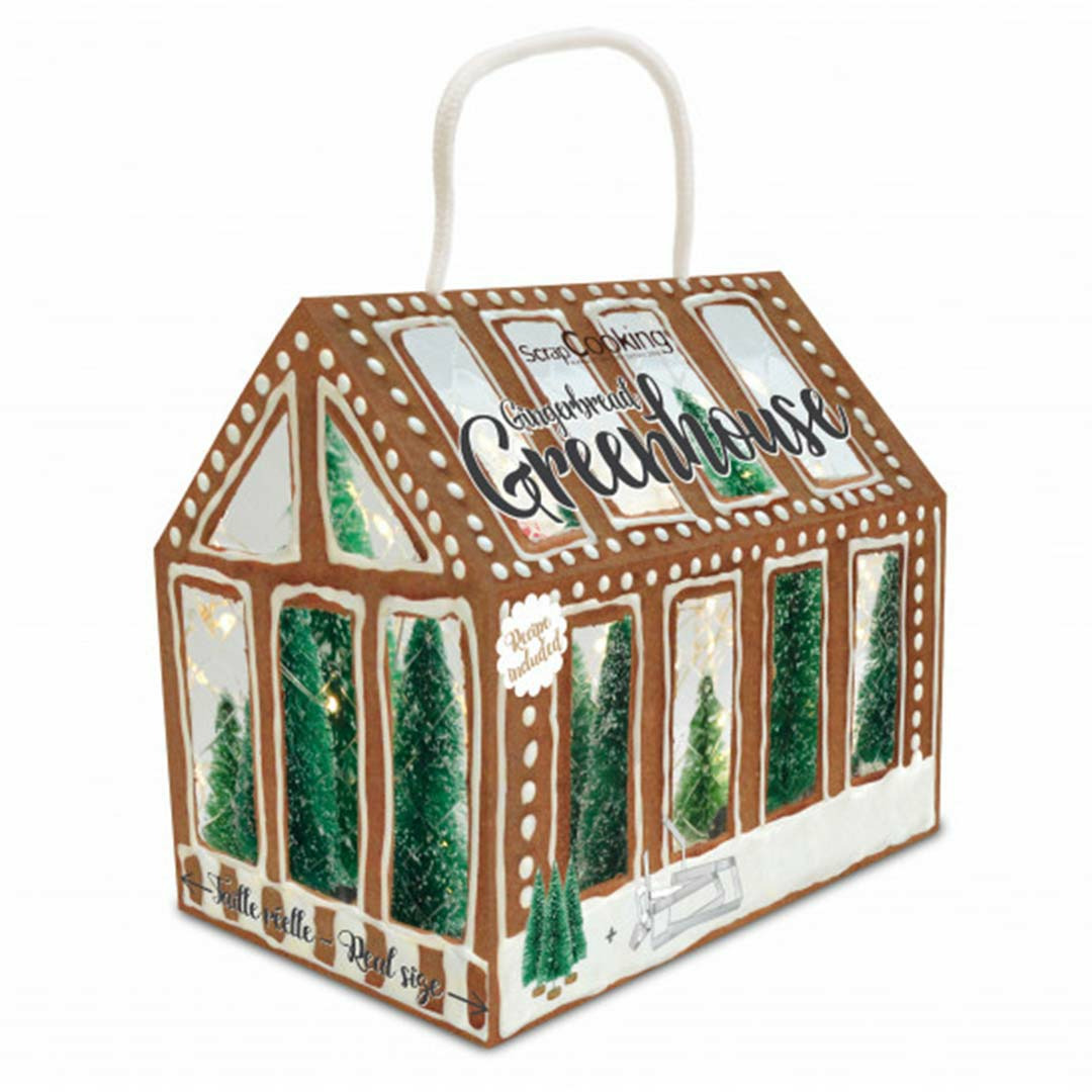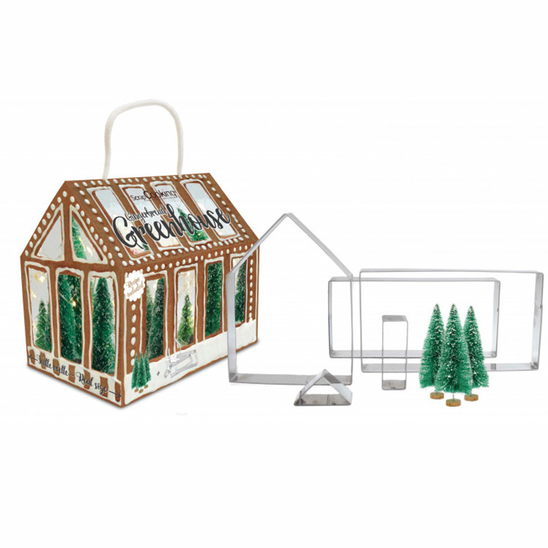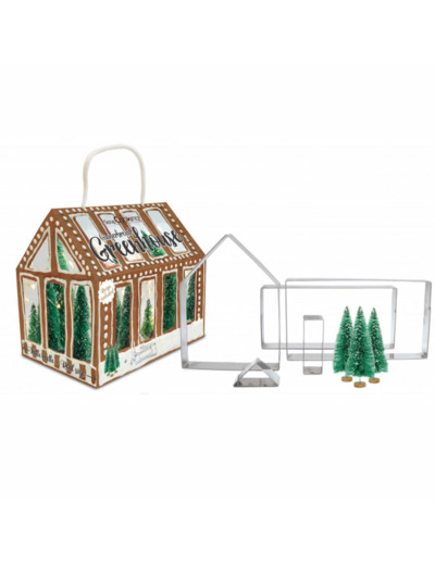 Un kit de 5 emporte-pièces en inox et 3 sapins décoratifs pour créer une maison en pain d’épices avec la recette au dos de la jolie boîte pour une expérience magique et festive !